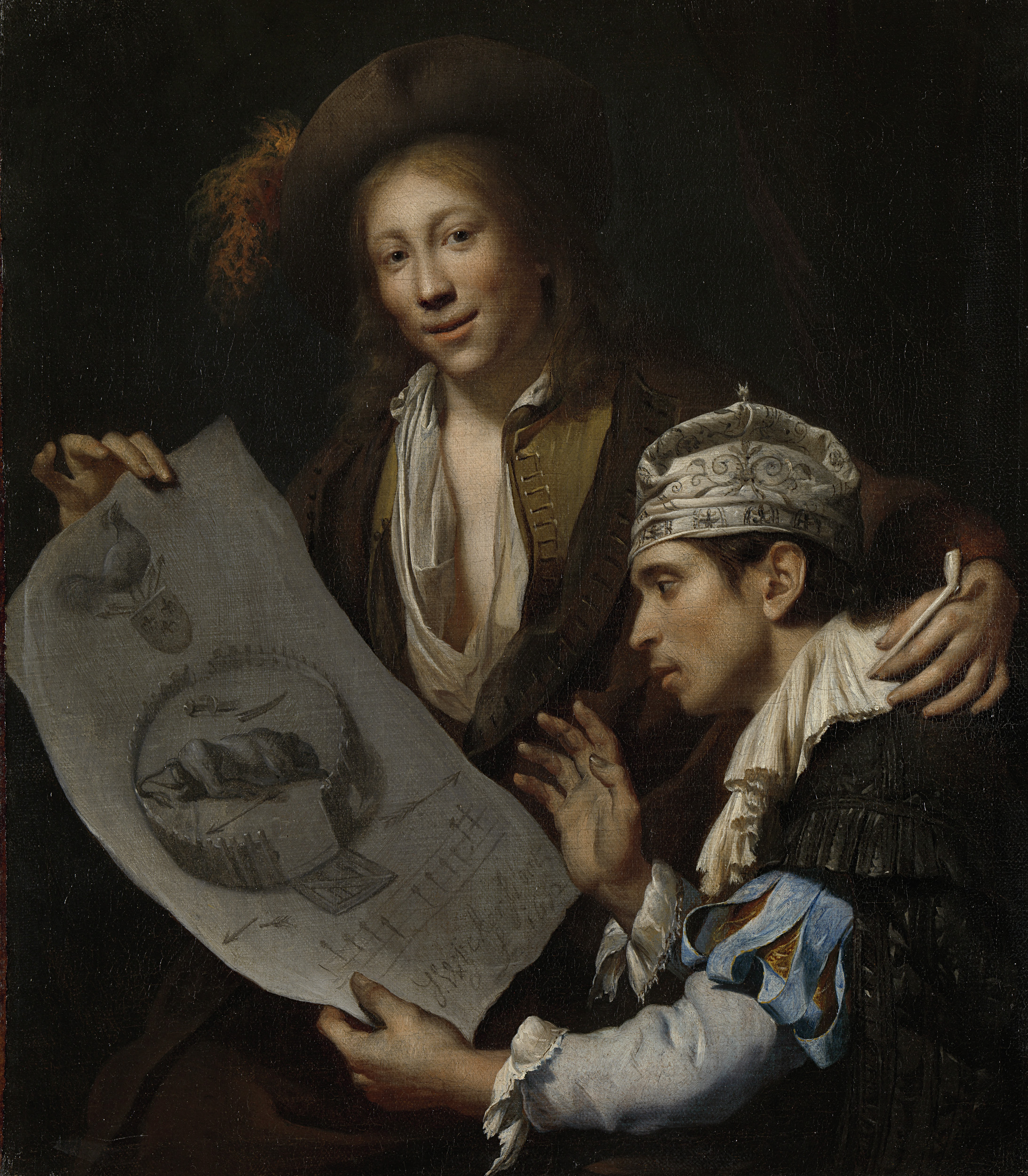 Gezelschap in 17e-eeuwse dracht bij een tafel waarop...