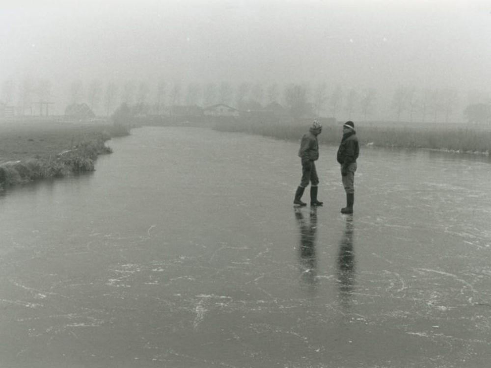 Foto van twee mannen op bevroren een sloot.