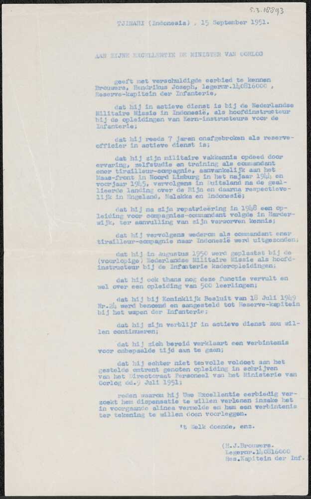 Verzoekschrift van kapitein Brouwers aan minister va...