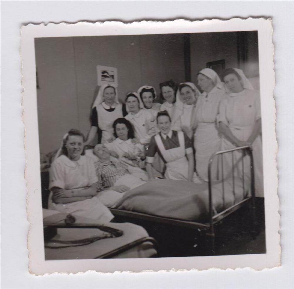 Foto van verpleegsters, poserend rondom het bed van ...
