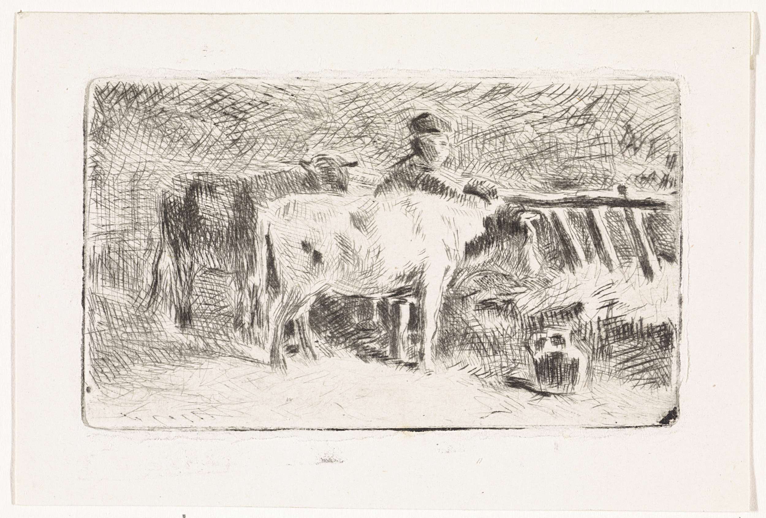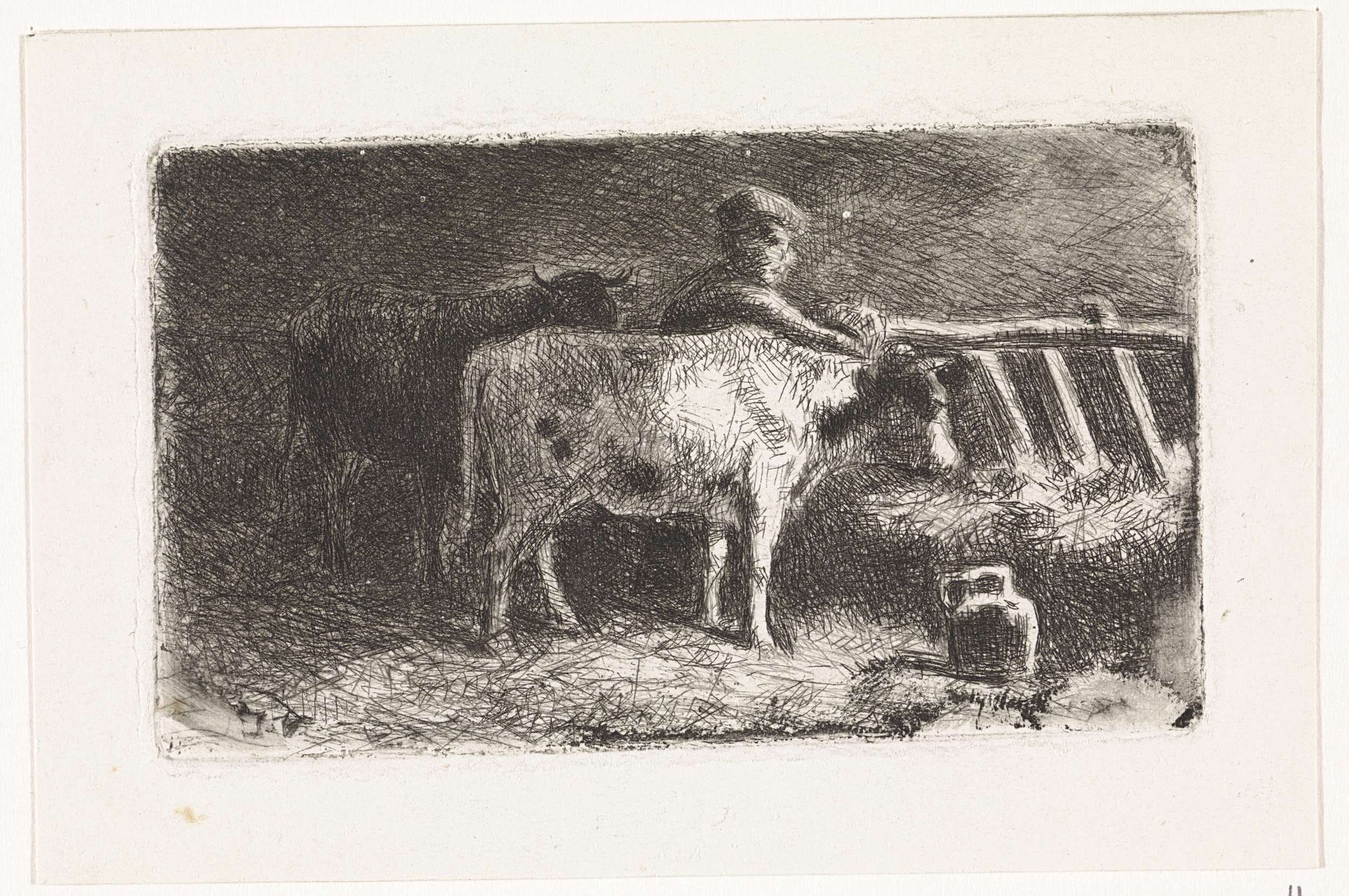 Boer tussen twee koeien bij een ruif in een stal (kl...
