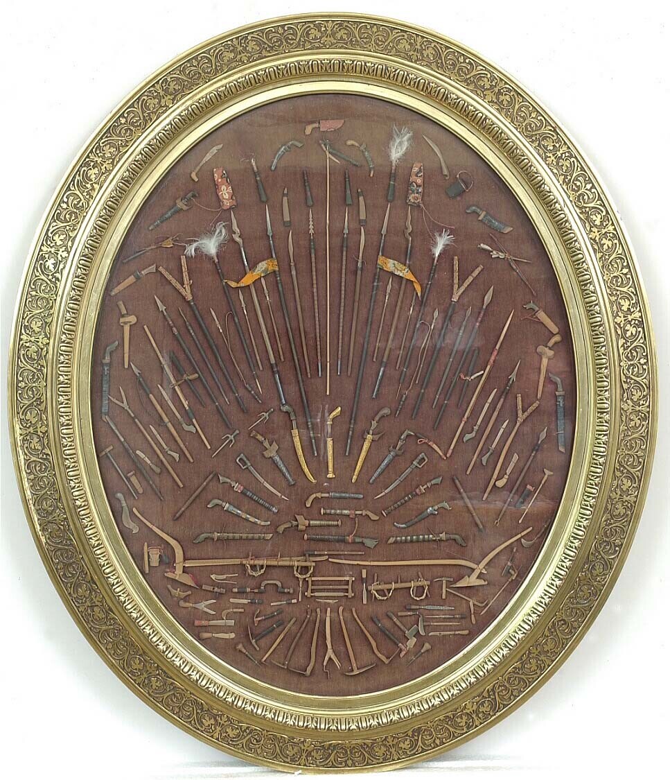 Ingelijste verzameling miniatuurwapens en -werktuigen