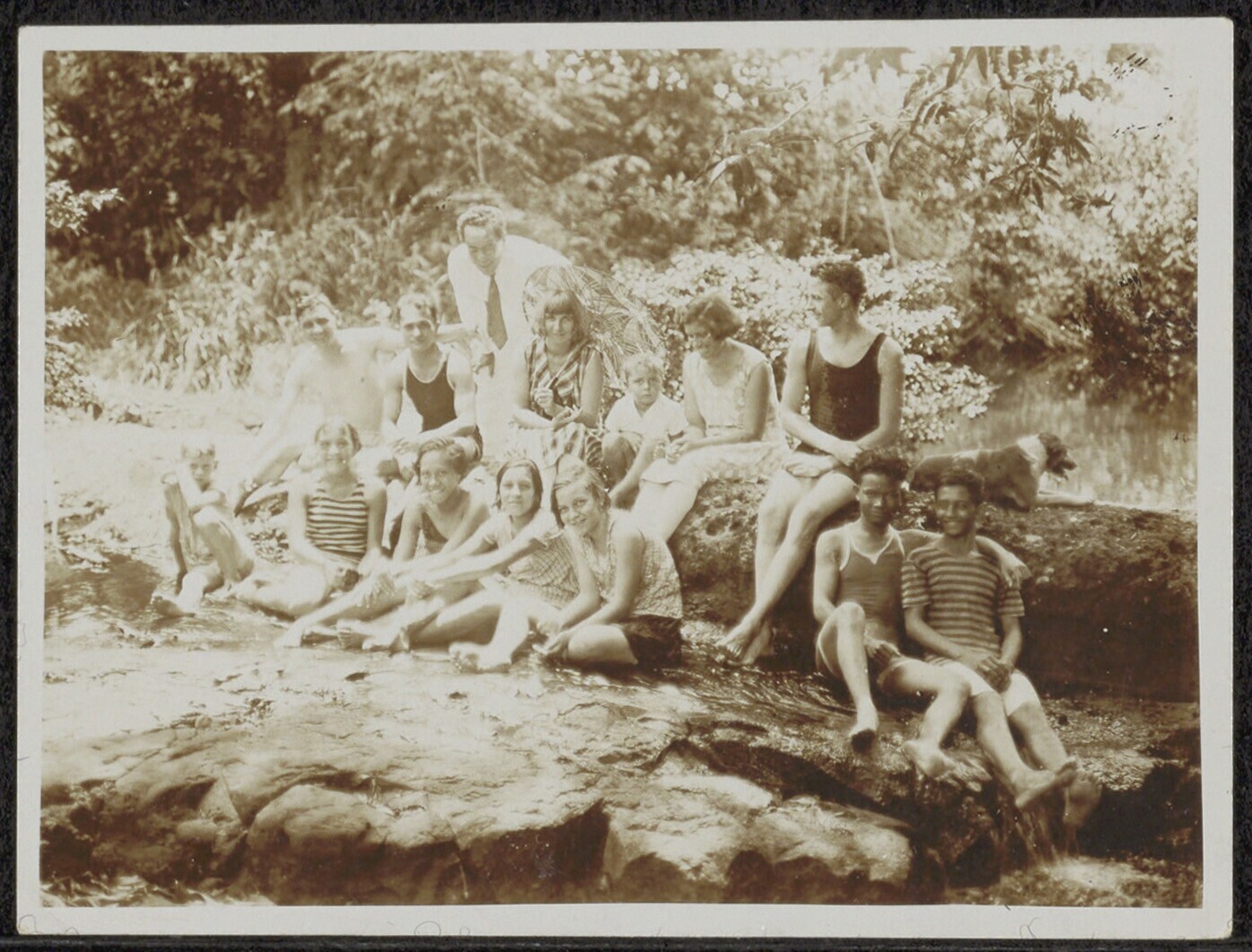 Portret van een groep mensen, waarvan een deel in ba...