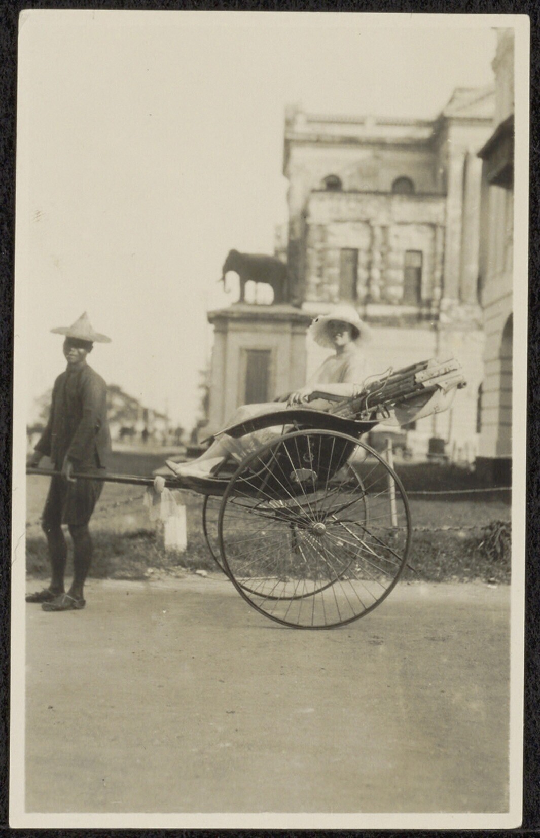 Portret van een vrouw in een rikshaw met de chauffeur