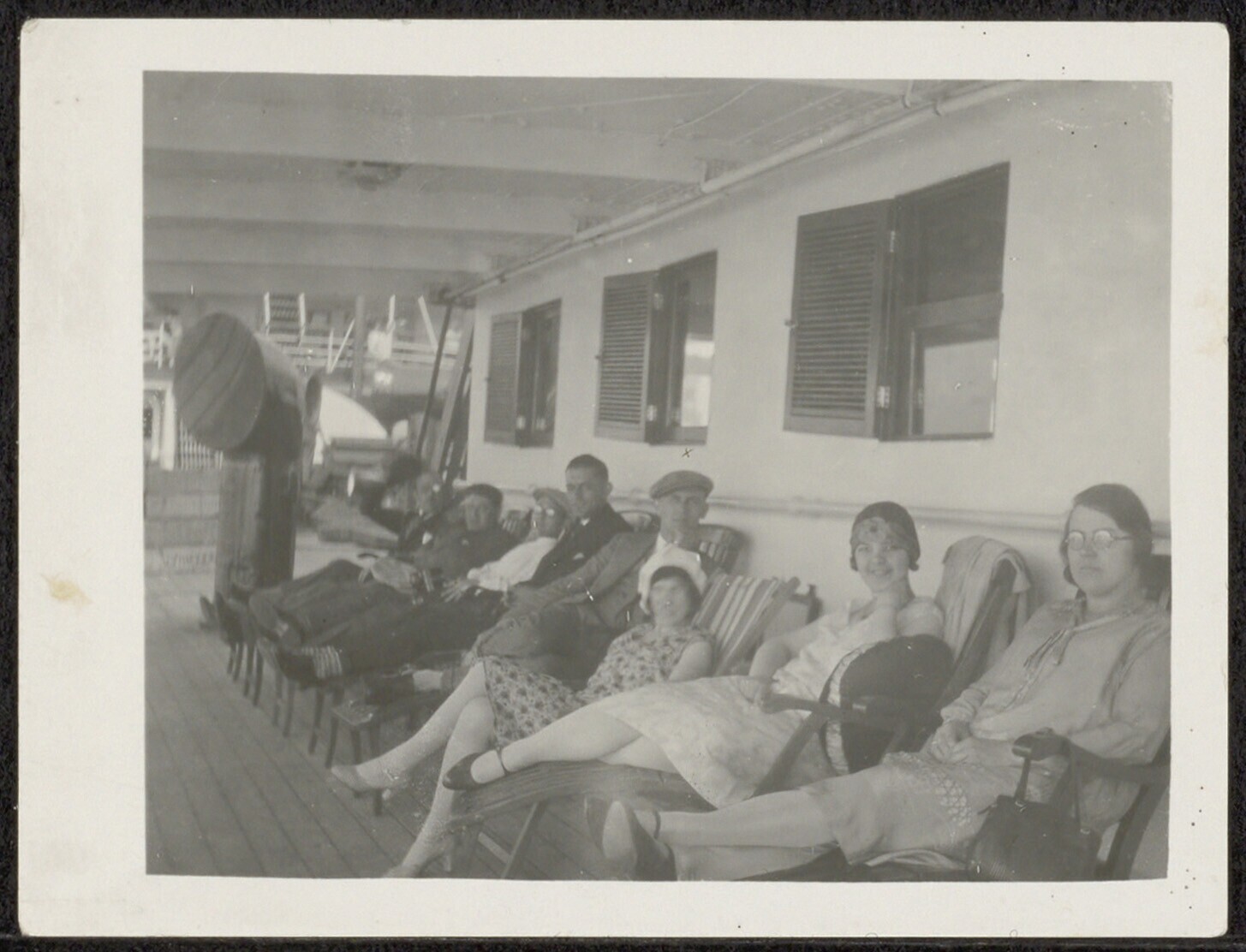 Portret van een groep mensen in ligstoelen aan bord ...