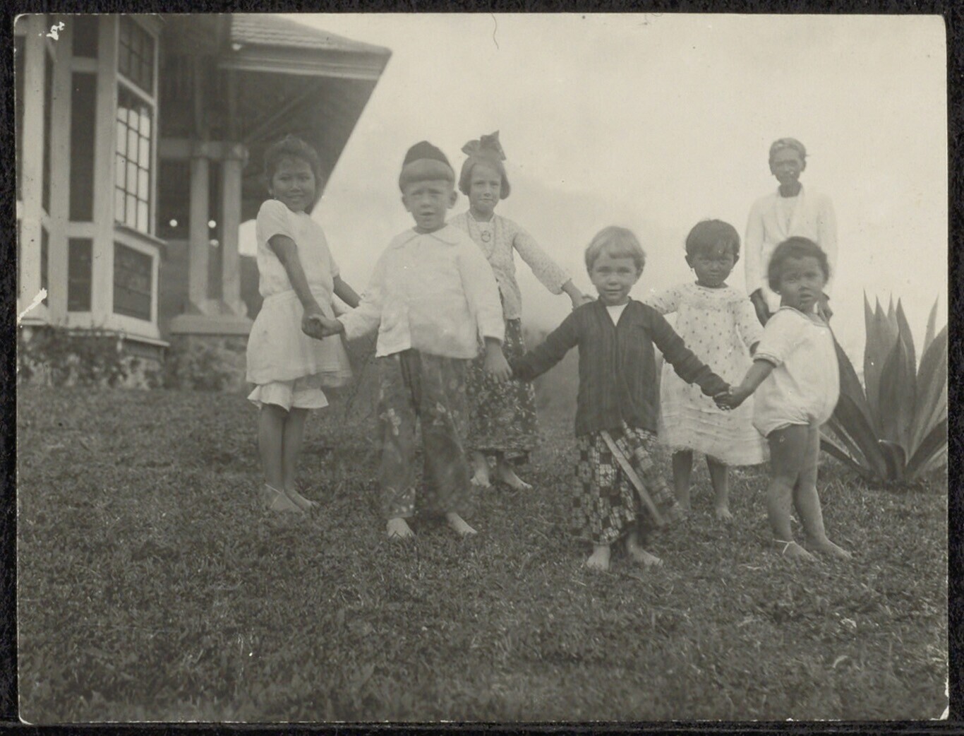 Portret van kinderen die hand in hand in een kring s...