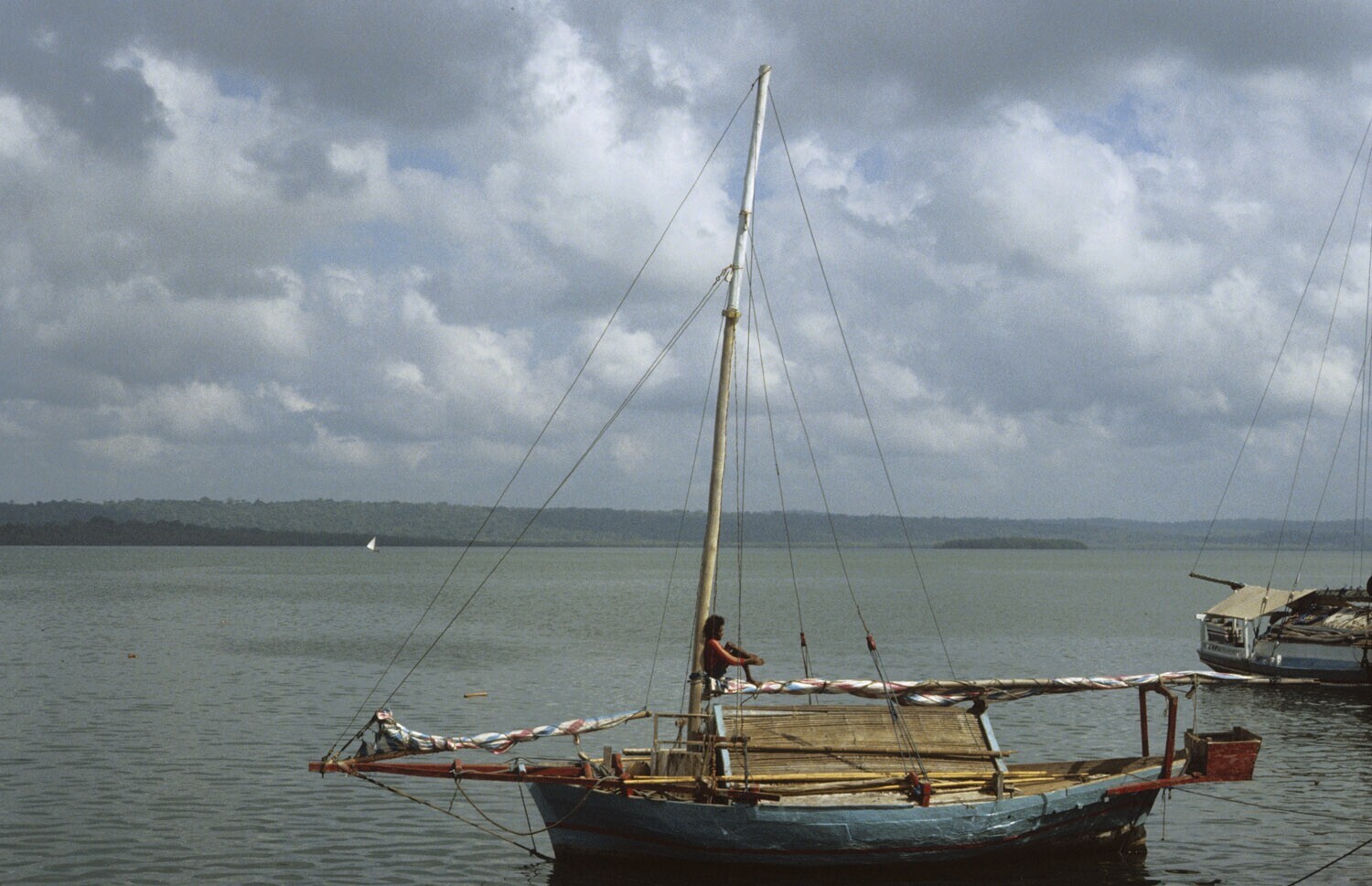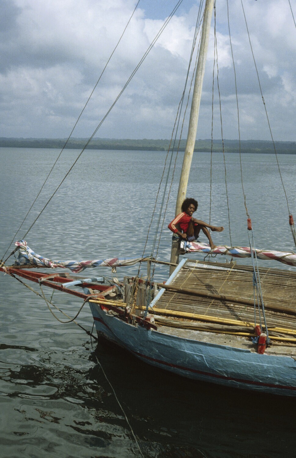 Een kleine zeilprauw voor de kust van Tanimbar, Molu...