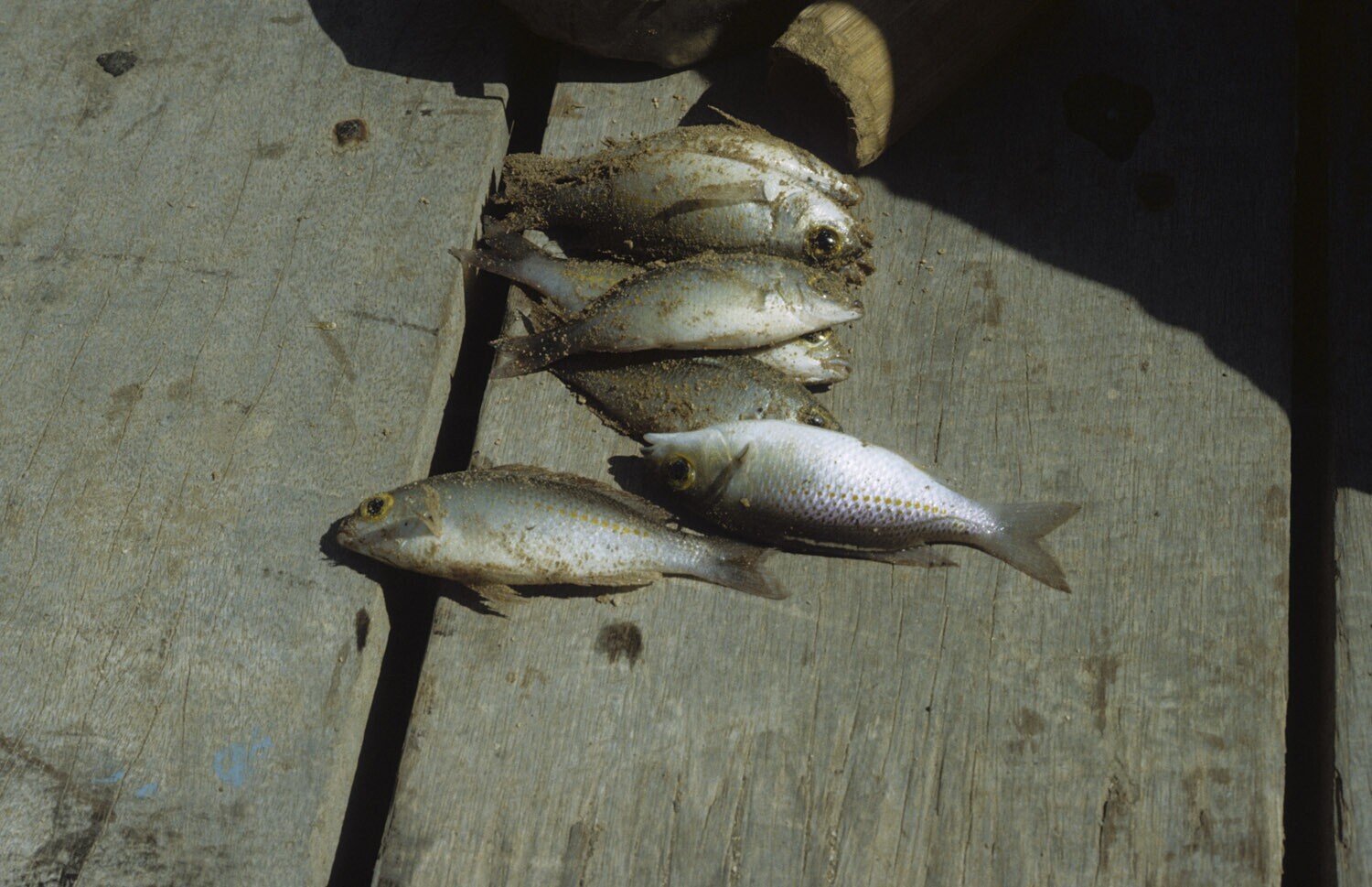 Gevangen vissen op de aanlegsteiger in Saumlaki op T...