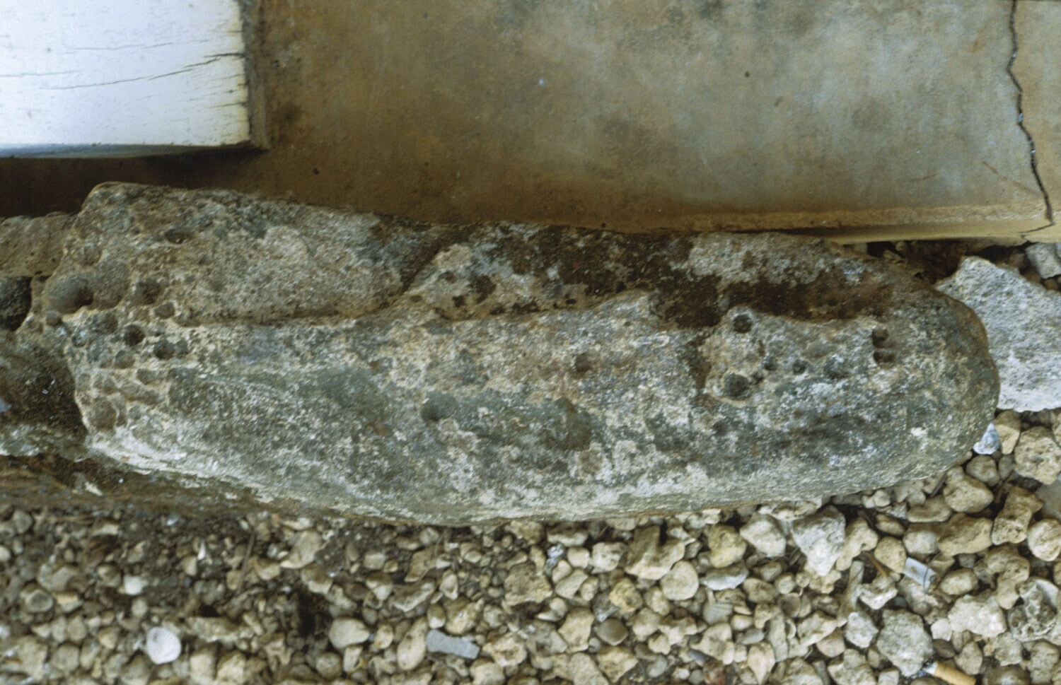 Een afgebroken stuk beeldhouwwerk, dit zat op de voo...