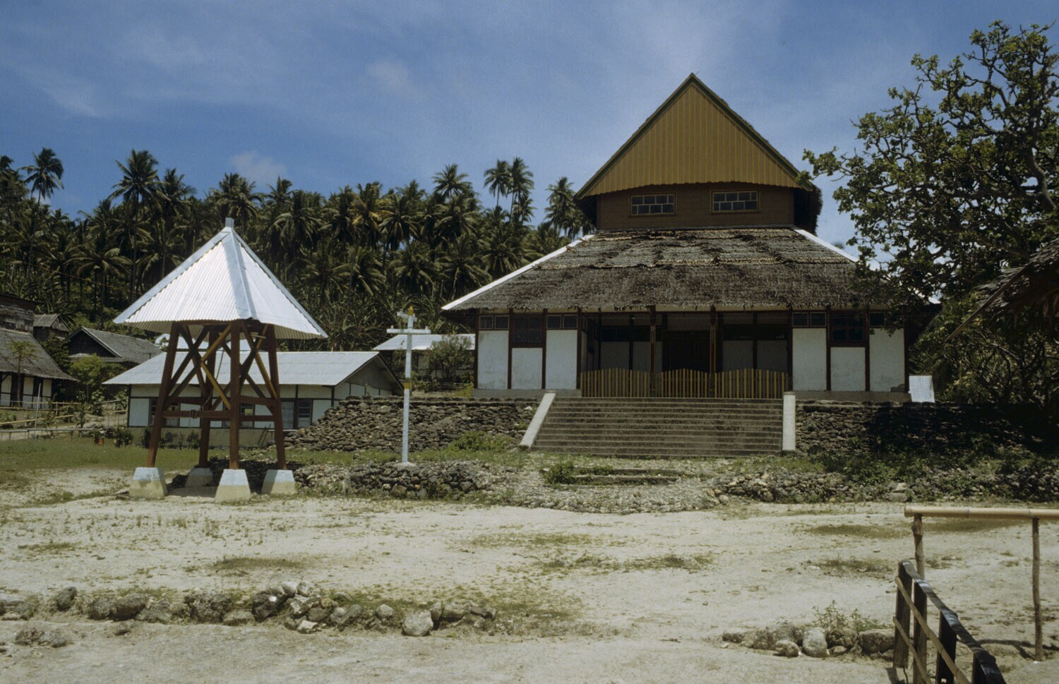 De R.K.missiekerk van voren gezien op Tanimbar, Molu...