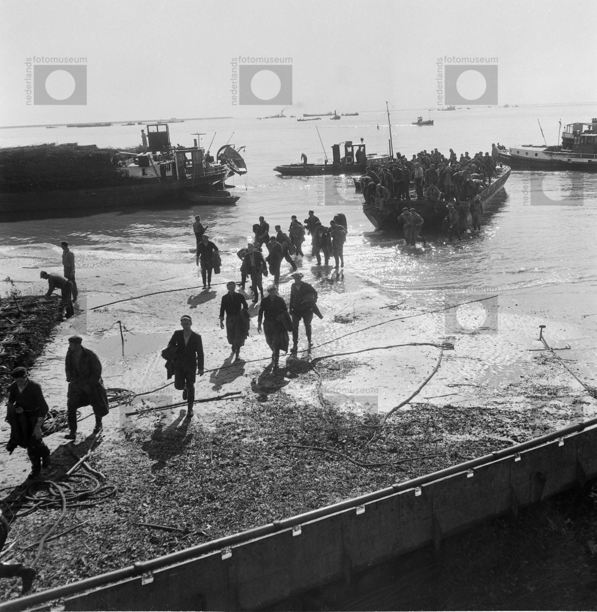 Groep arbeiders gaat van boord van schip, mogelijk n...