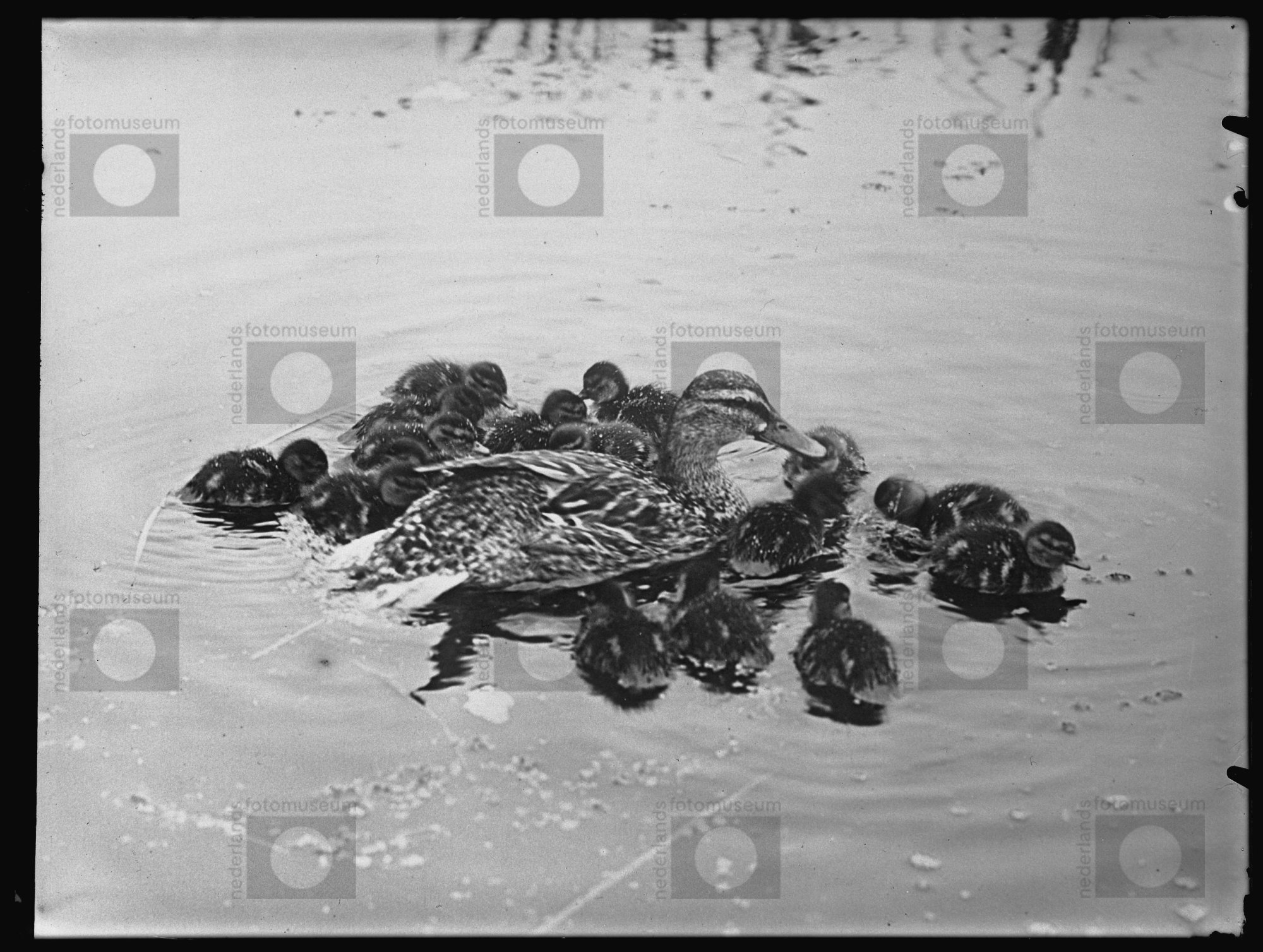 Wilde eend, een kooieend, met jongen in sloot bij An...