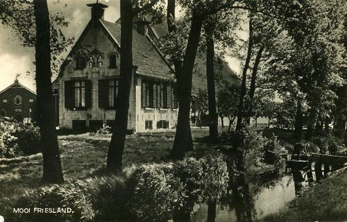 Prentbriefkaart in sepia van een boerderij tussen ho...
