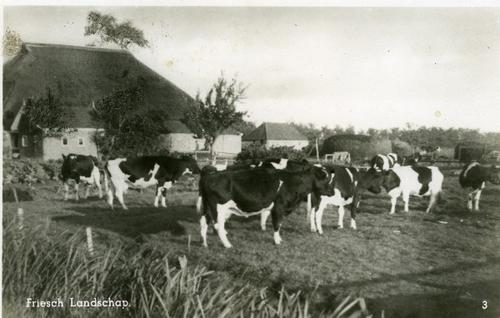 Prentbriefkaart in zwart-wit van een boerderij met k...