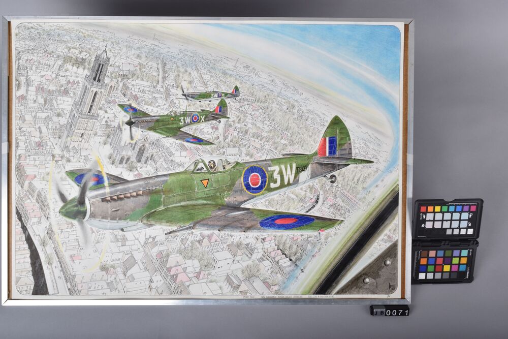 Pasteltekening van Spitfire TB137 boven Utrecht