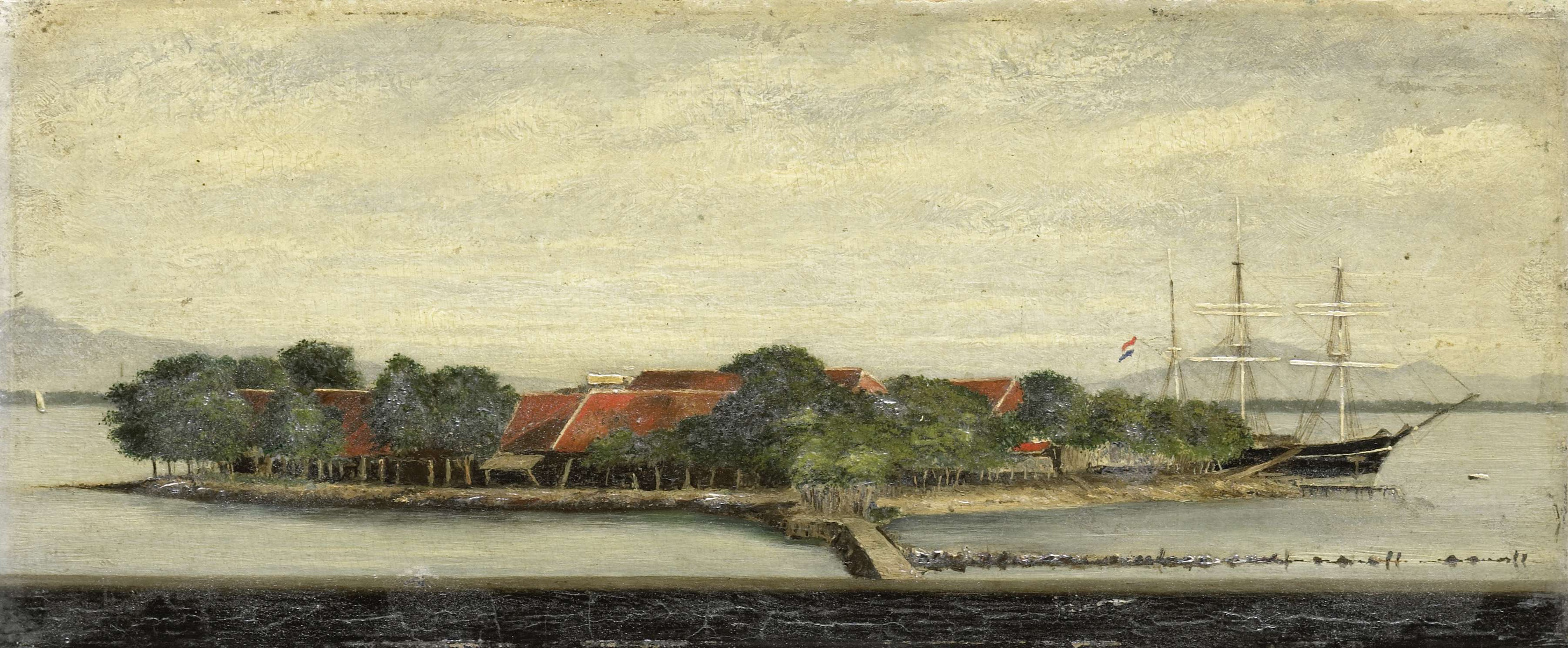 Gezicht op het eiland Kuiper in de baai van Batavia