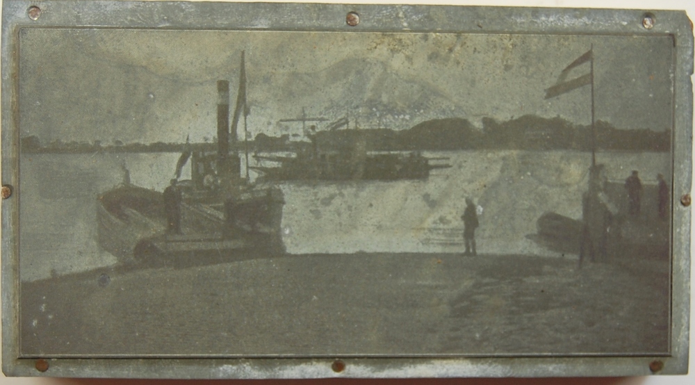 zinken cliché bevestigd op een houten blok met de af...