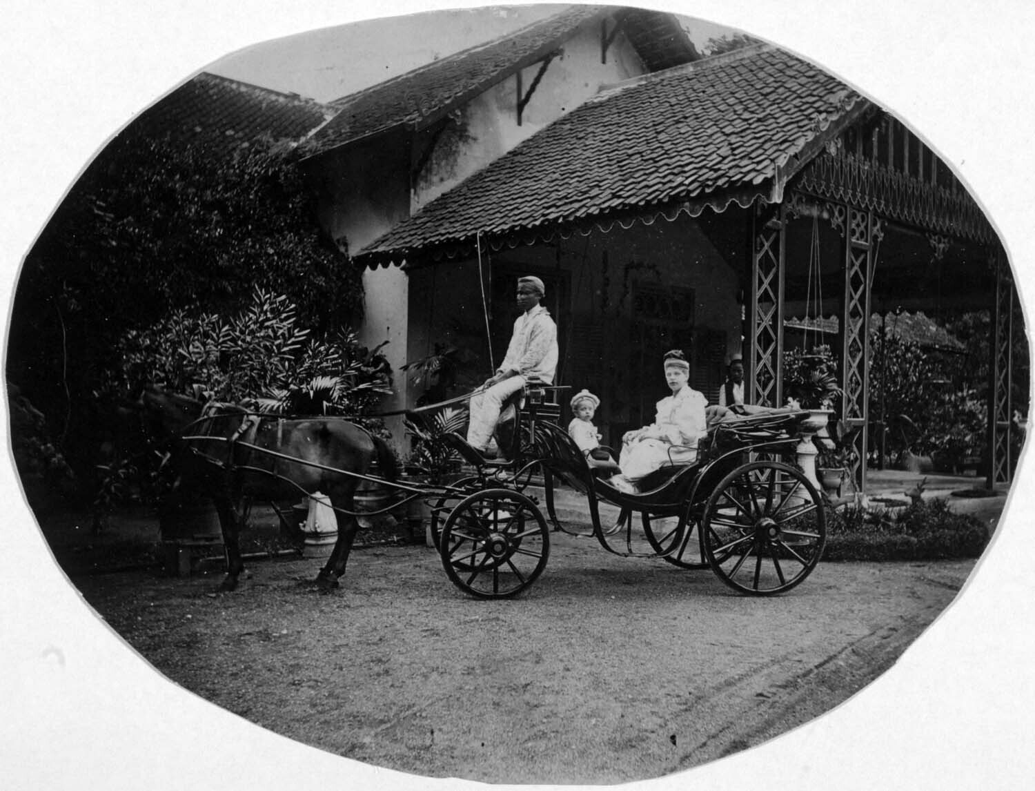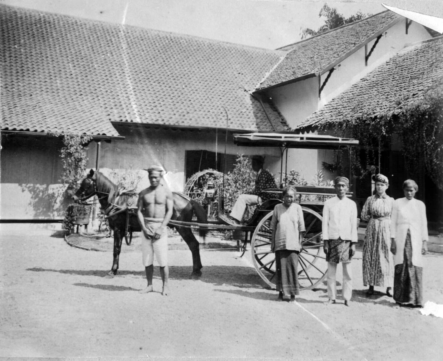 Eugenie en Wimmie Mertens in een rijtuig en leden va...