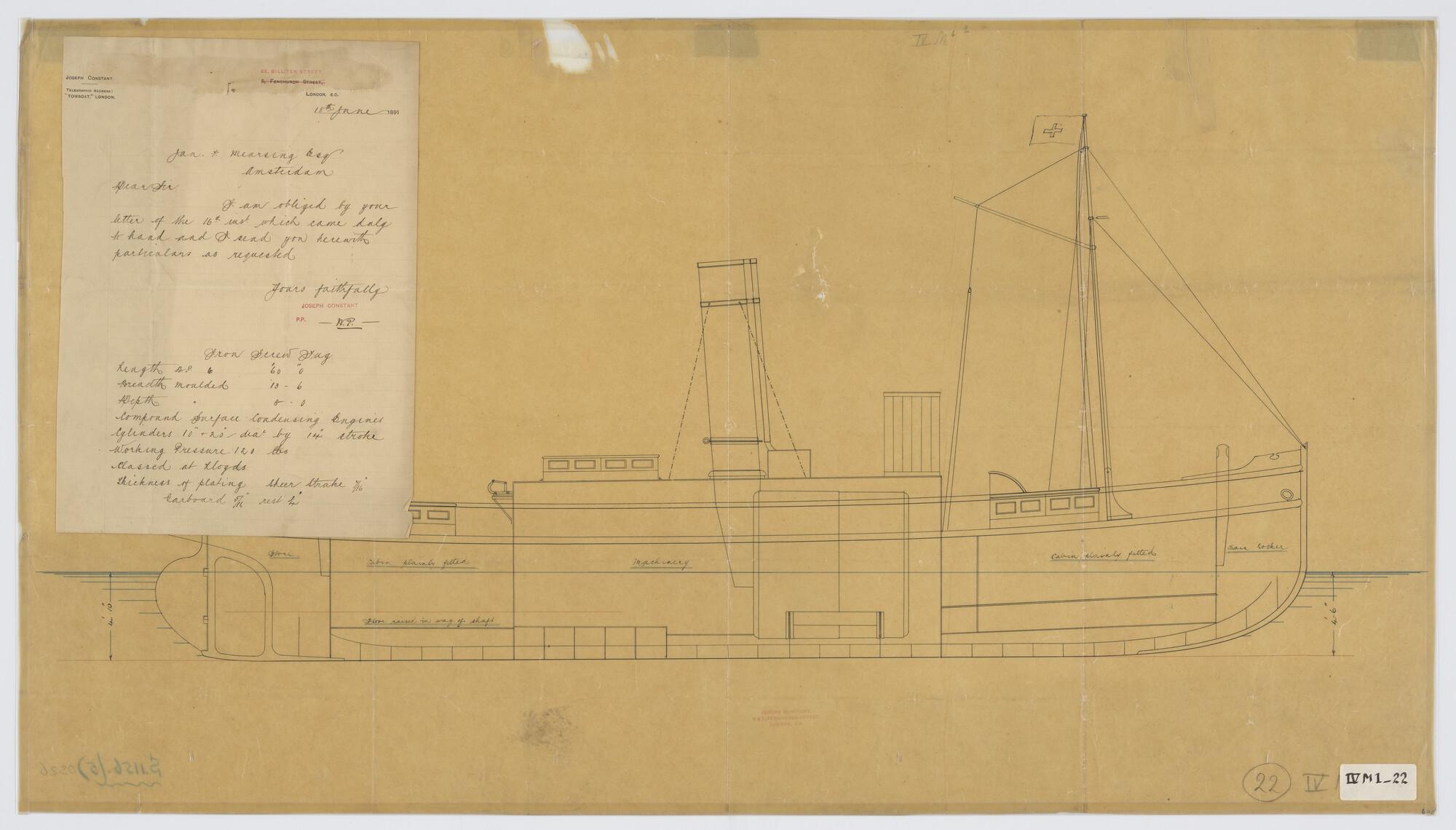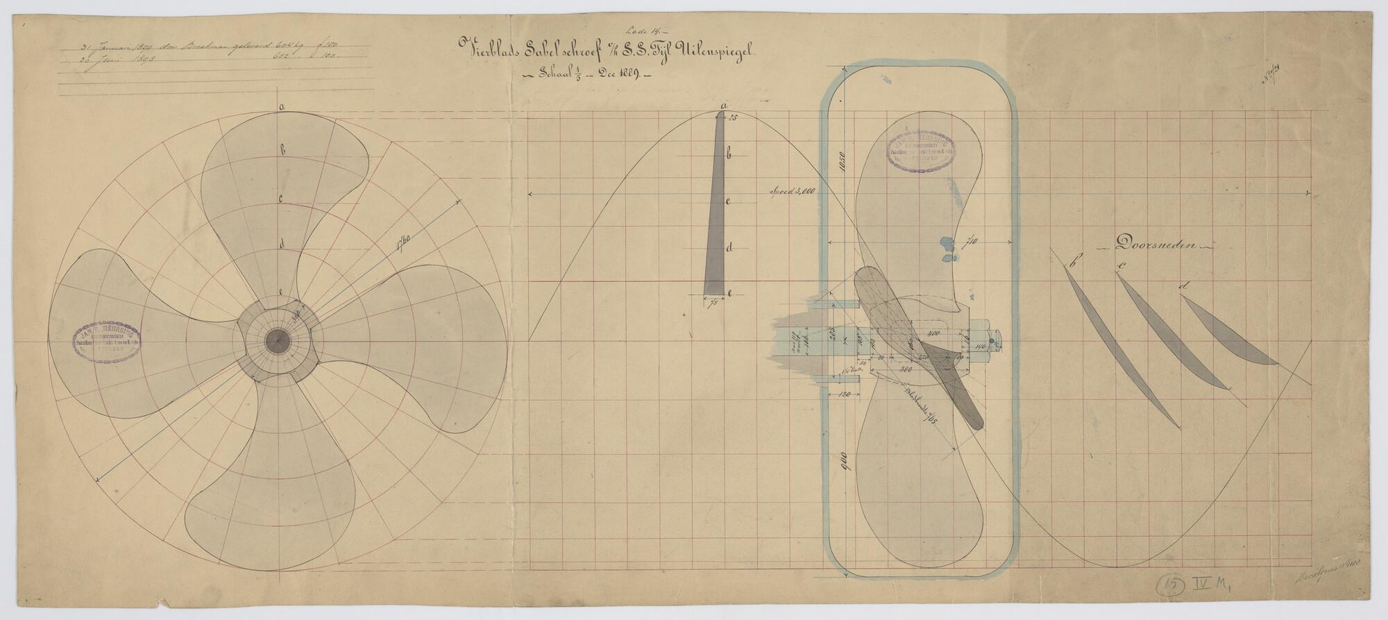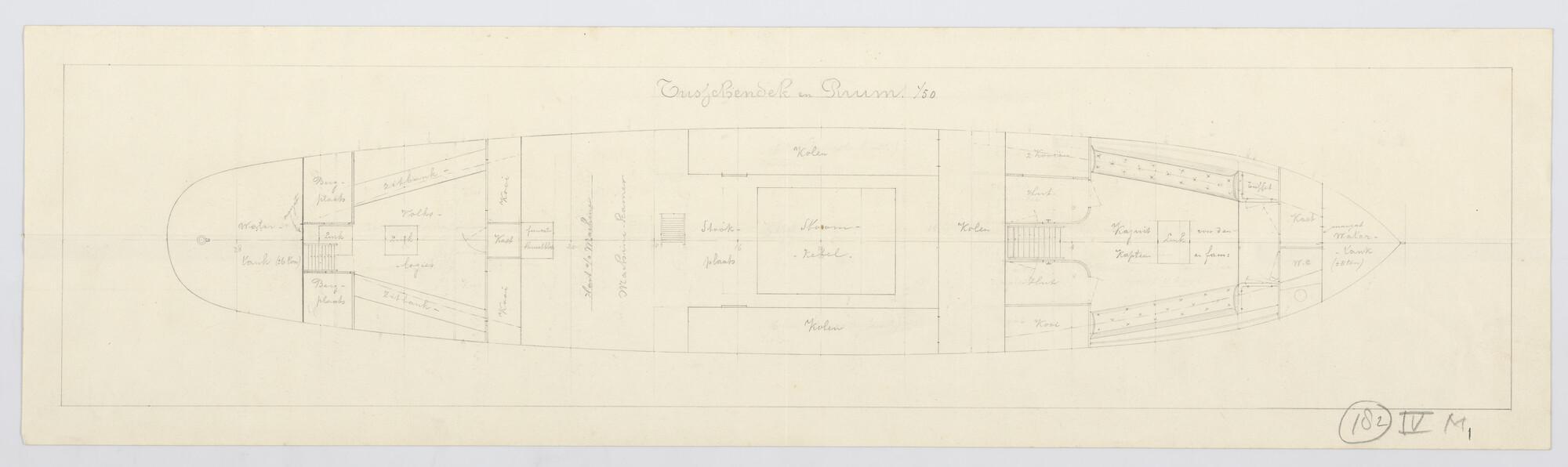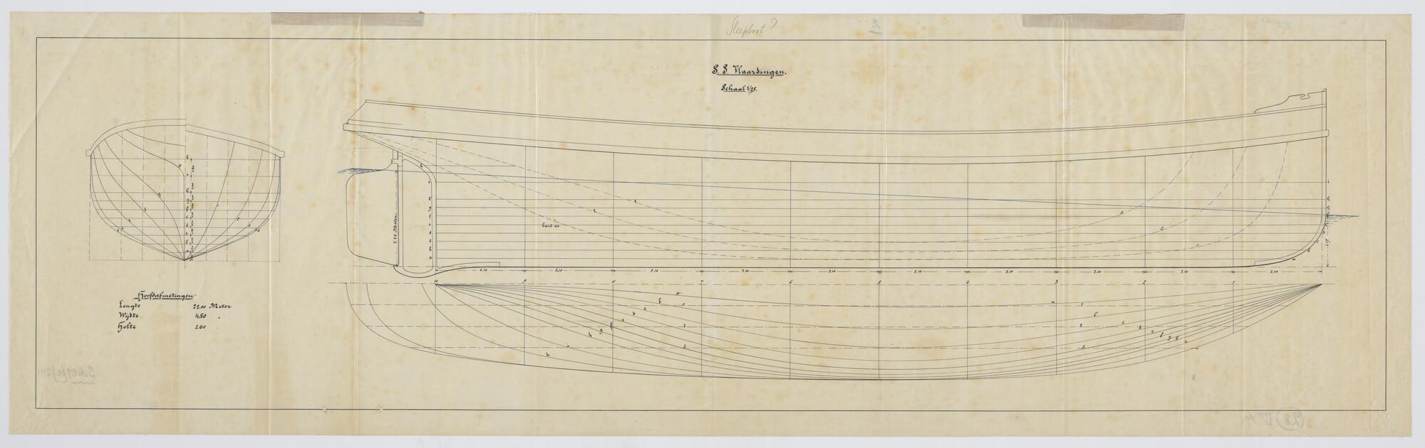 Verticale langsdoorsnede, spantenraam en waterlijnen...