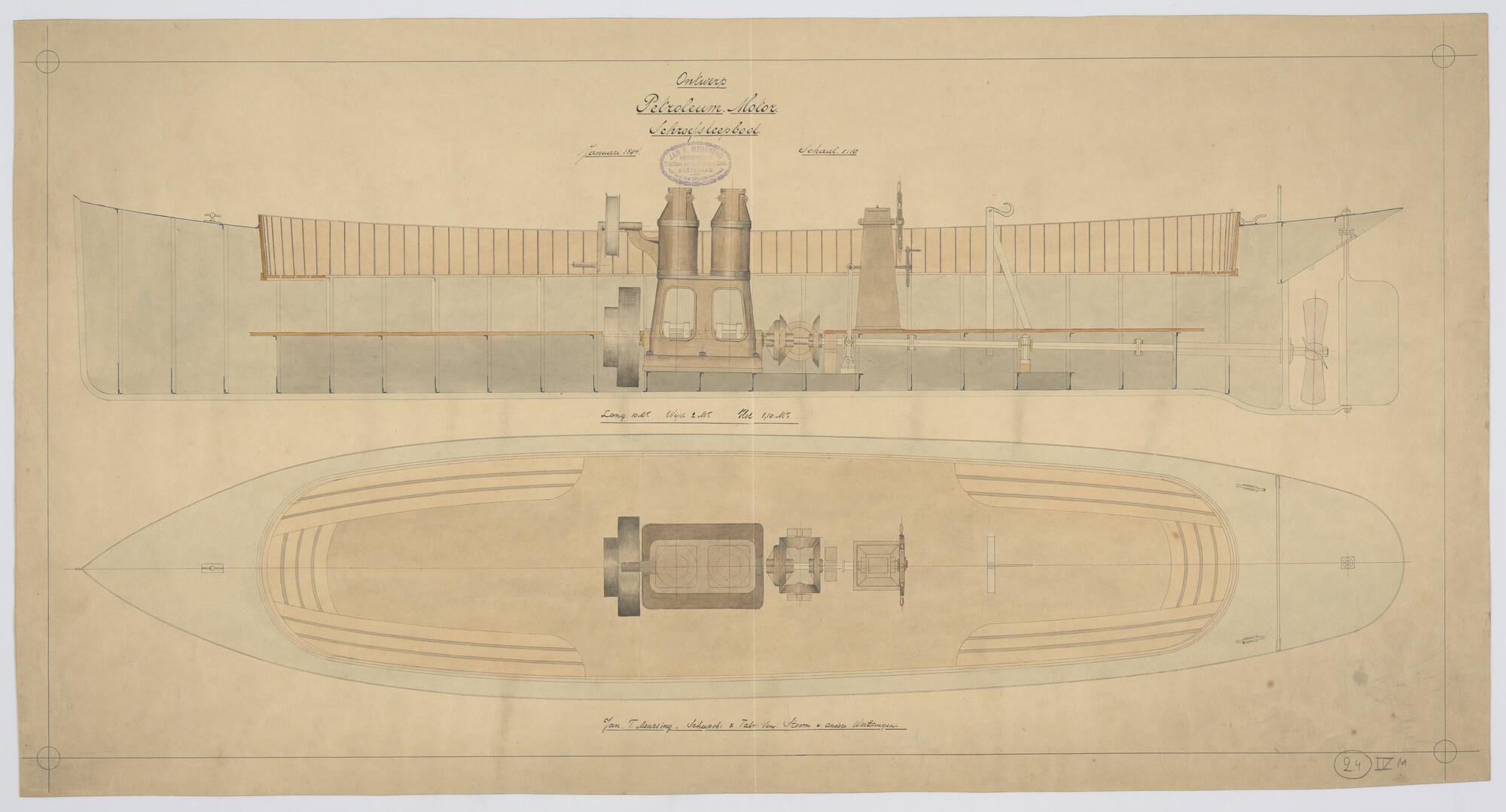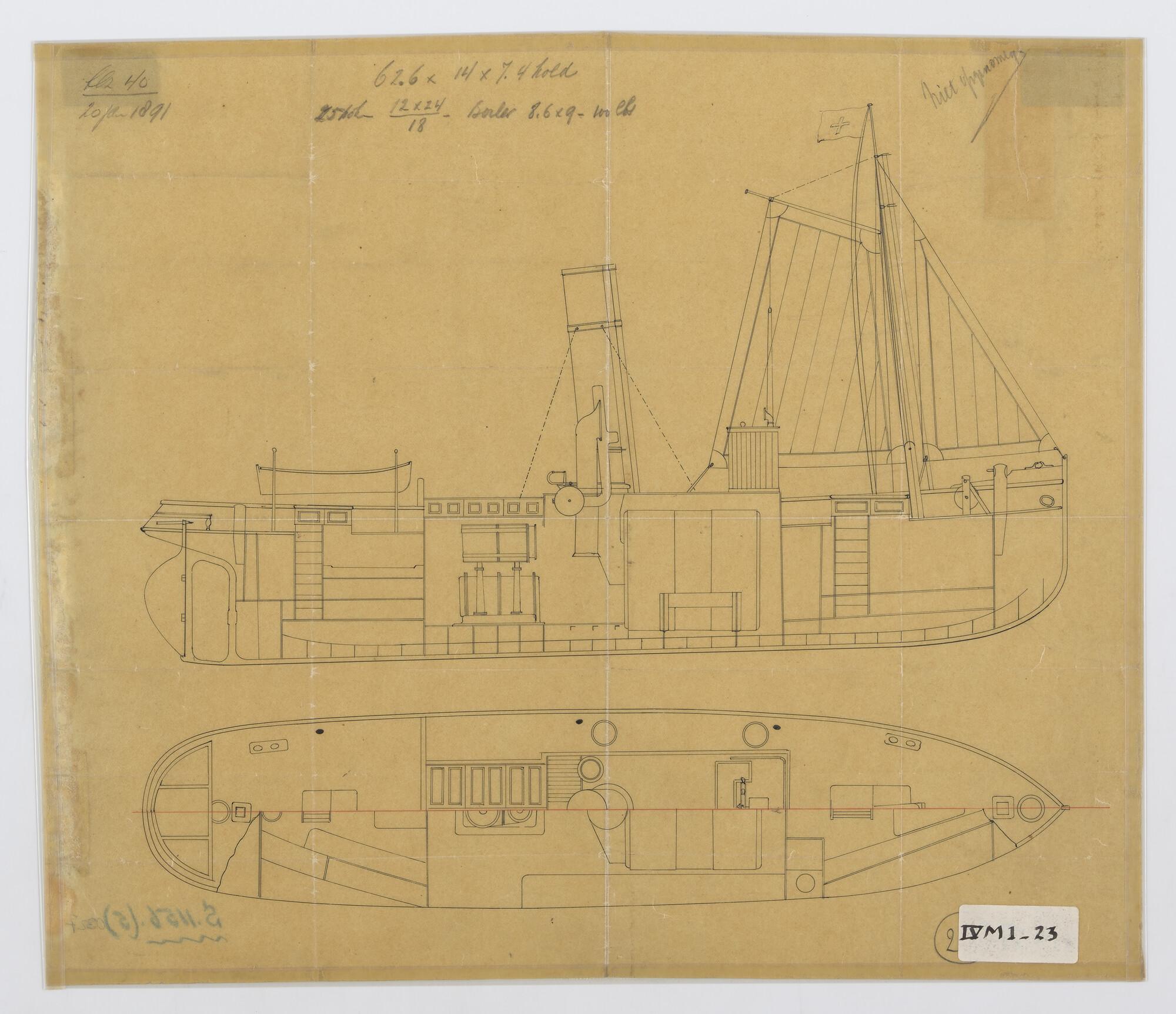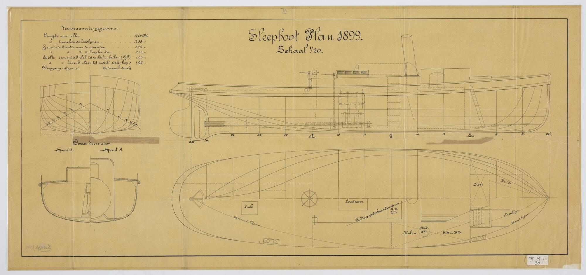 Verticale langsdoorsnede en bovenaanzicht sleepboot ...