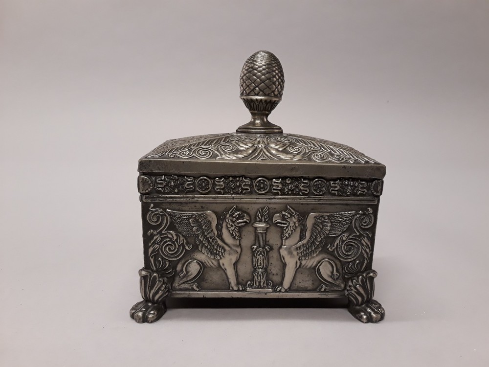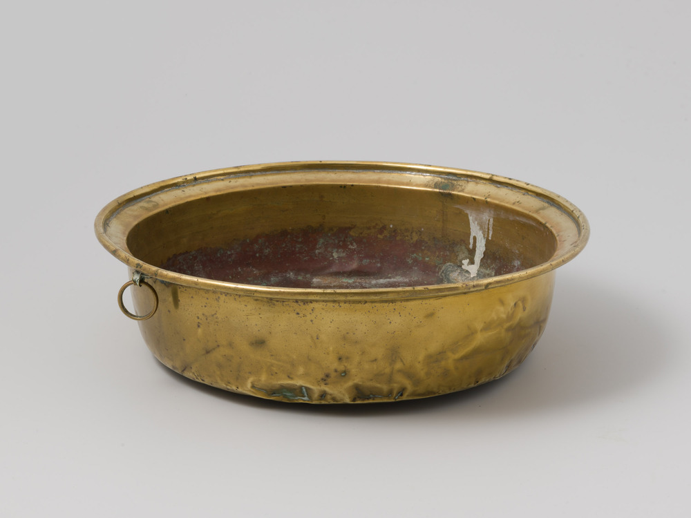 wijwaterbakje. Komvormig tinnen bakje met ingesnoerd...