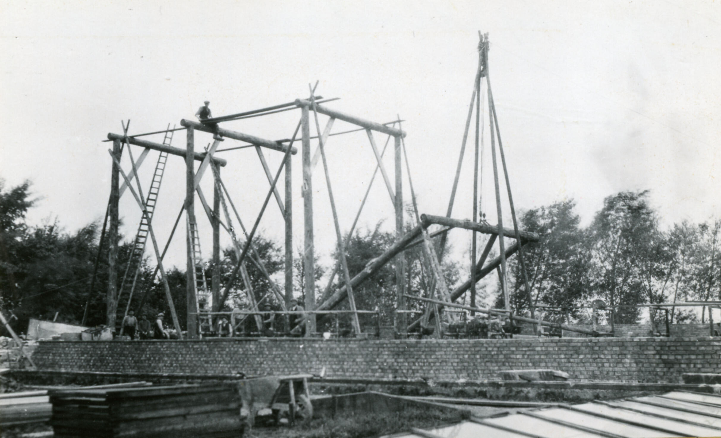Oprichten van een schuur, Almelo, 1935 (zwart-wit foto)