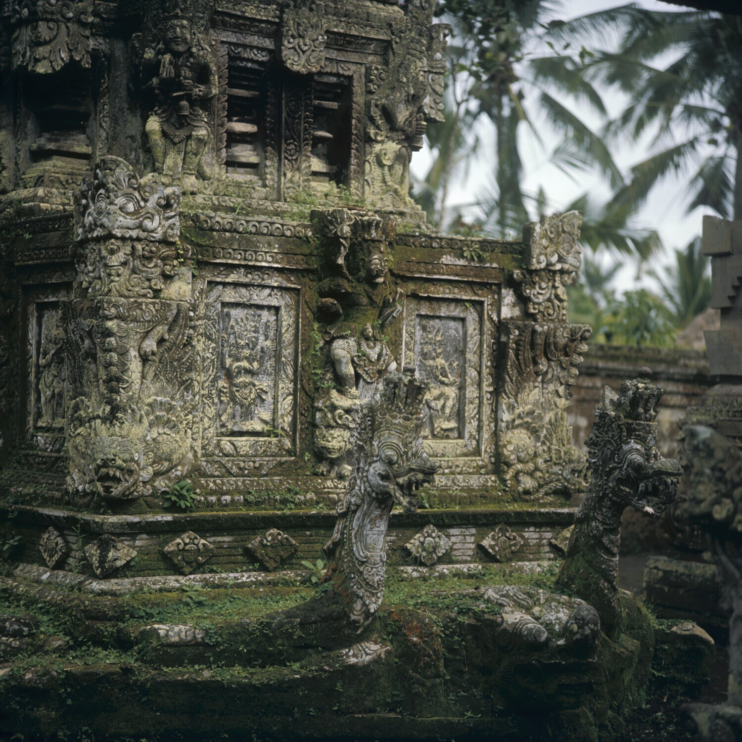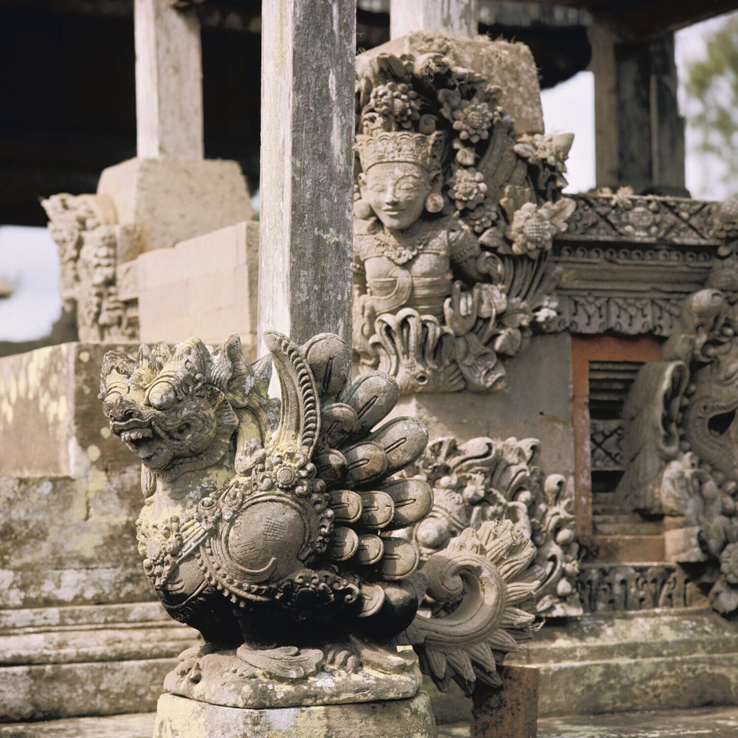 Apen rondom een beeld in het Heilige Apenbos bij Sangeh