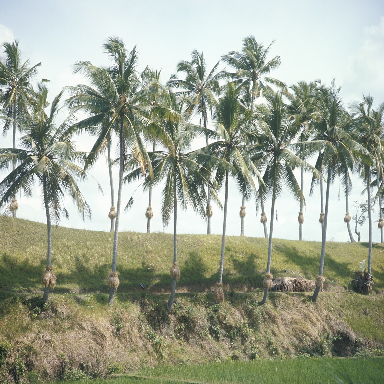 Kokospalmen. De bundels rijsthalmen geven aan dat de...