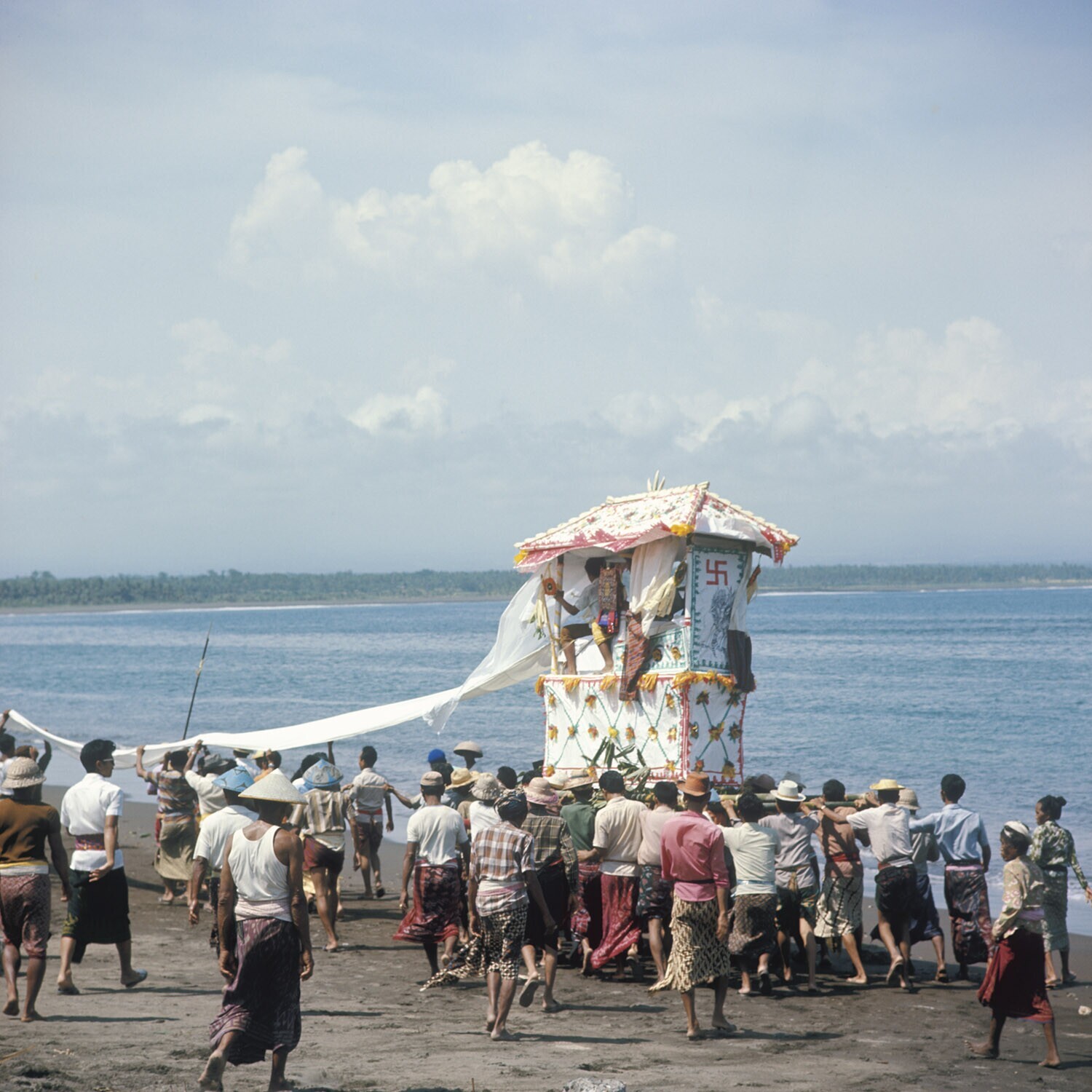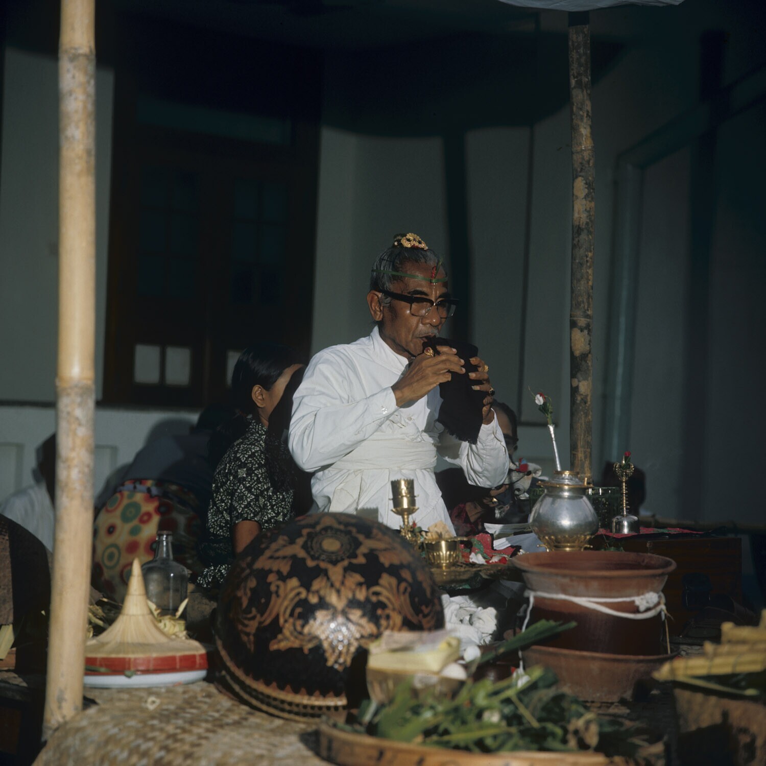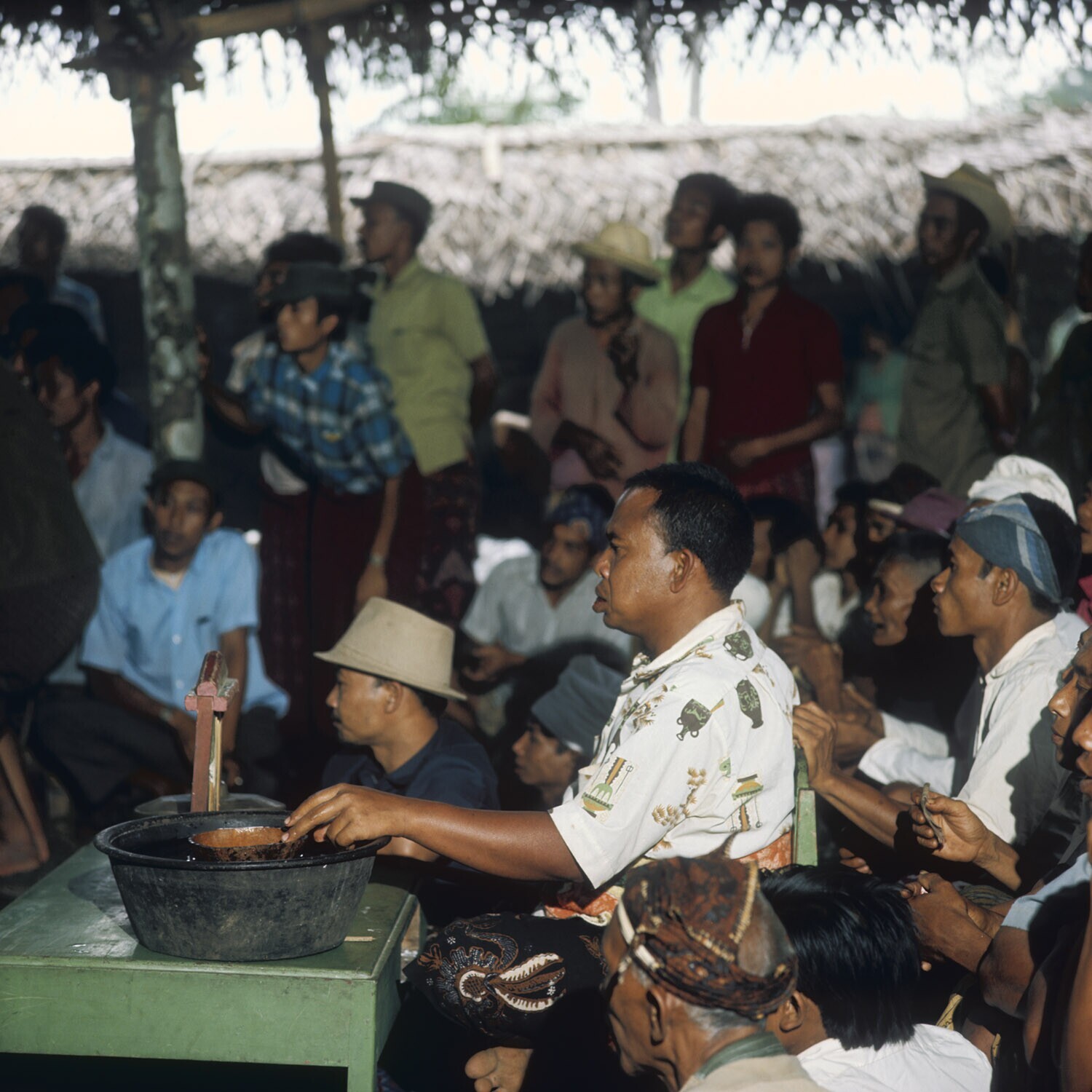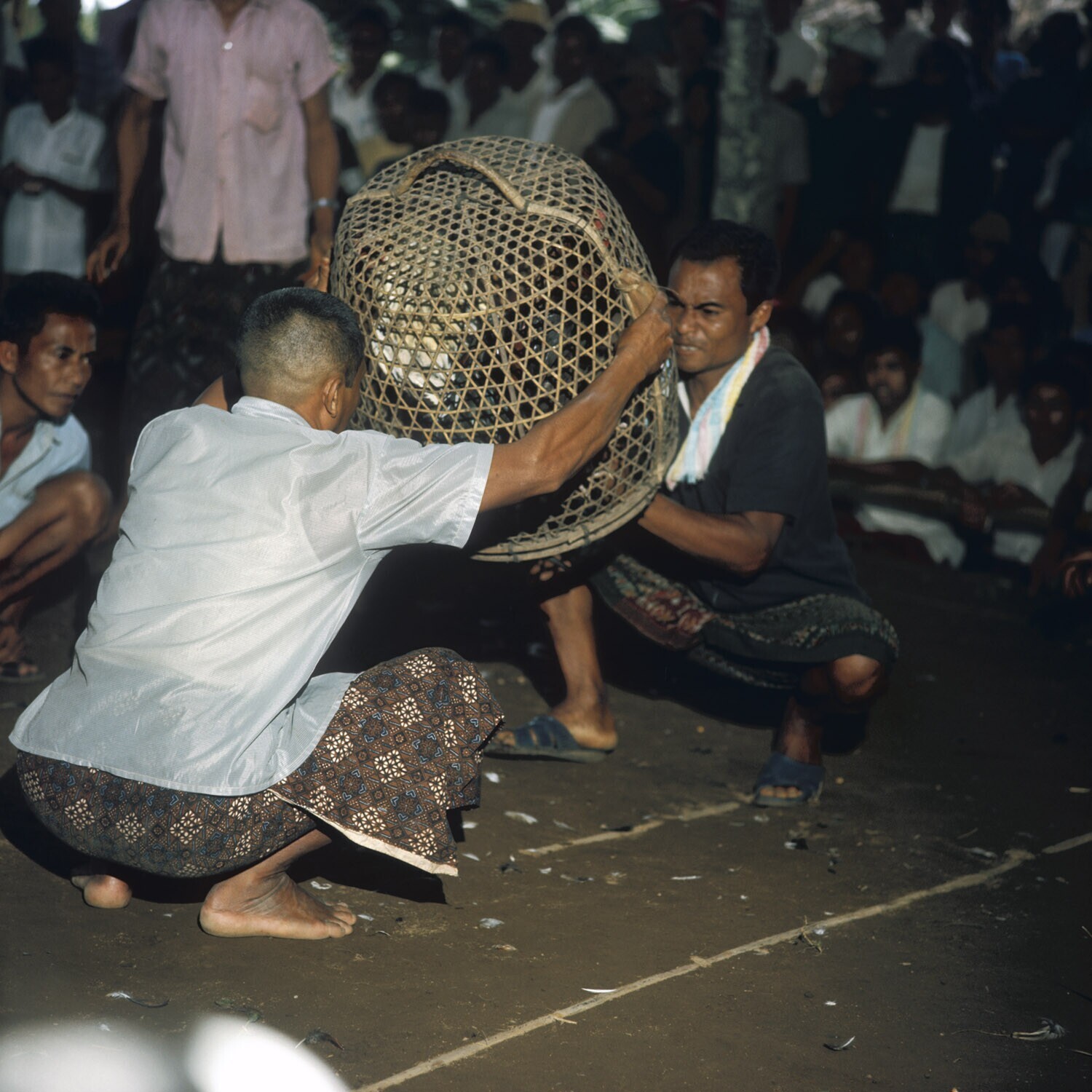 Hanengevecht in kampong Besakih, Bali. Mand waarin d...