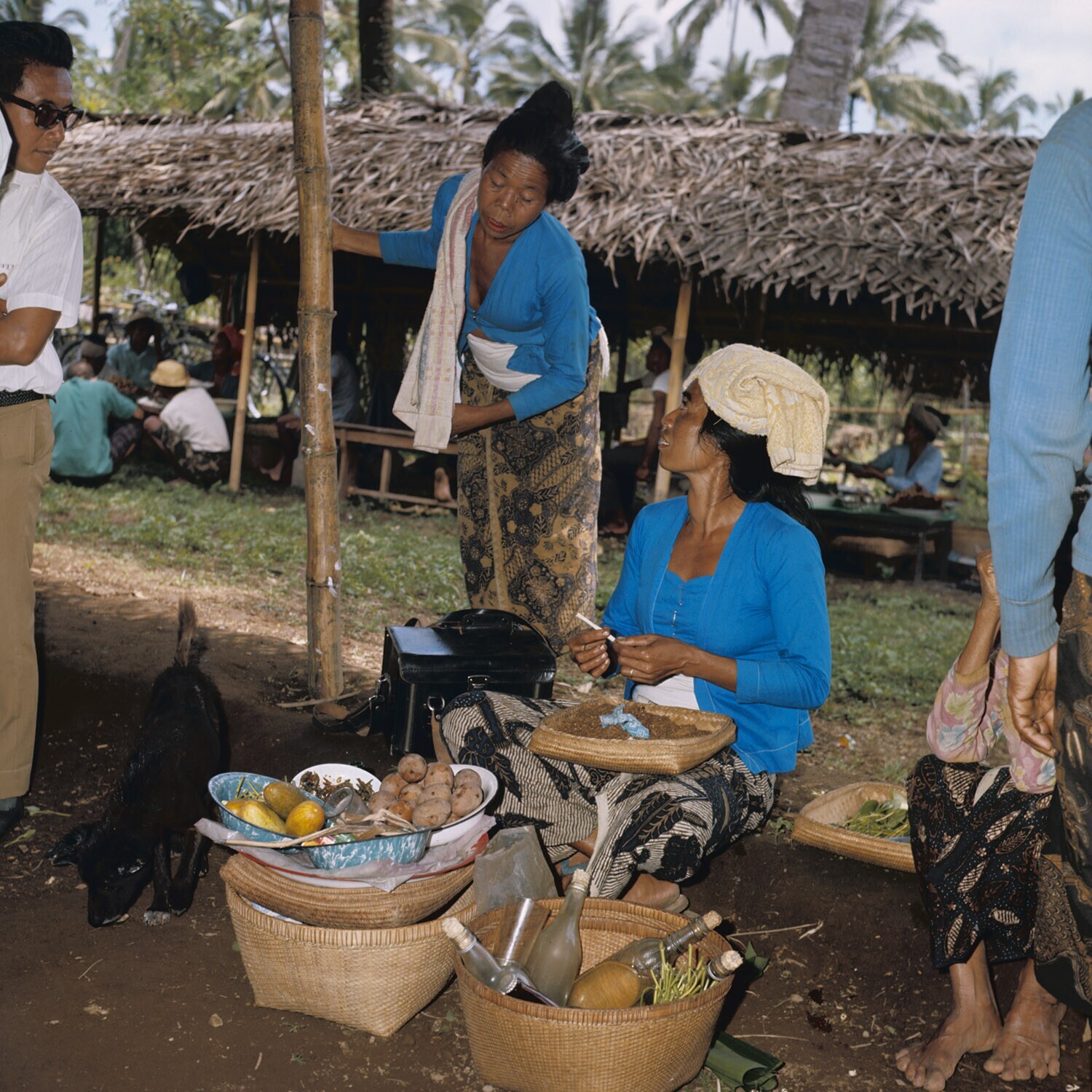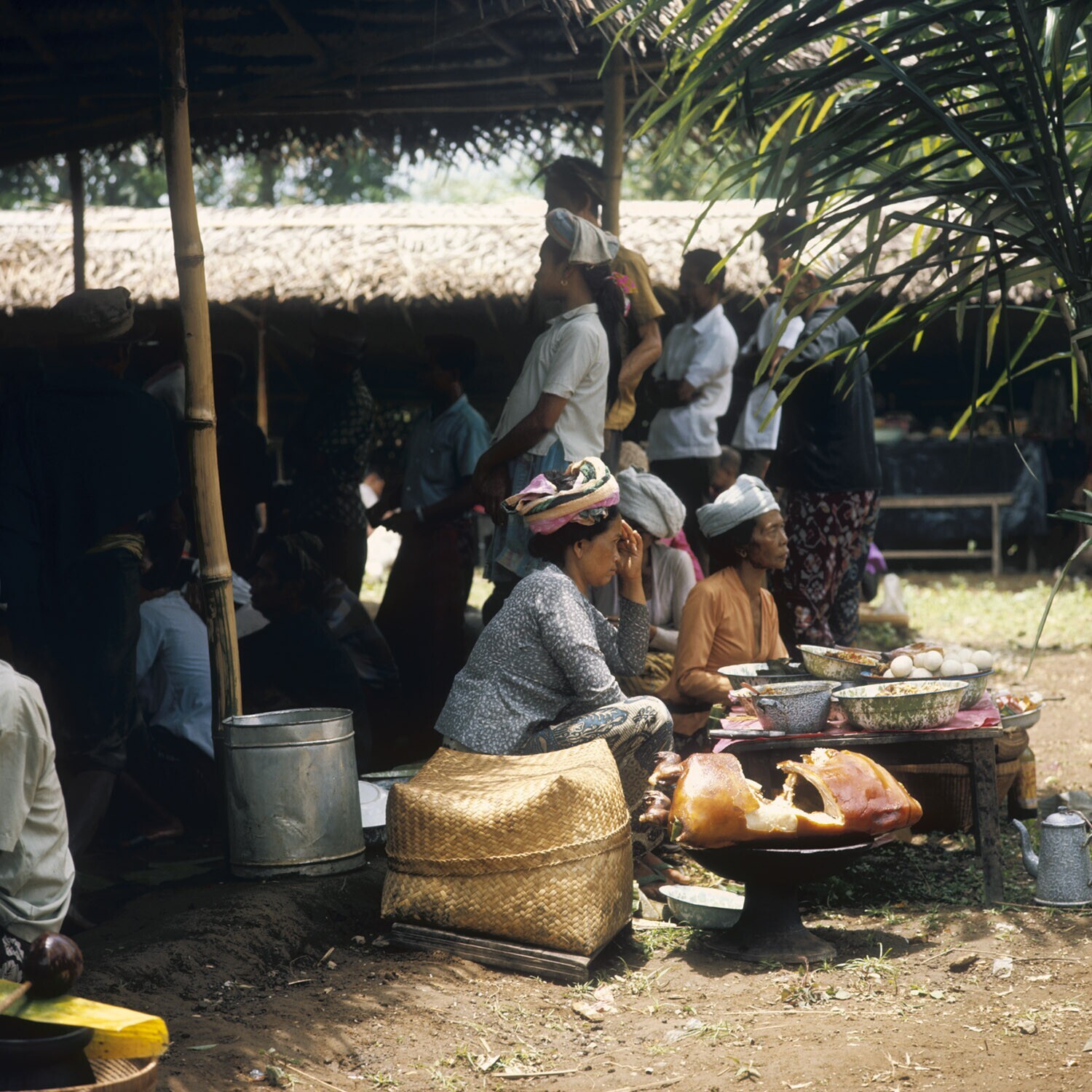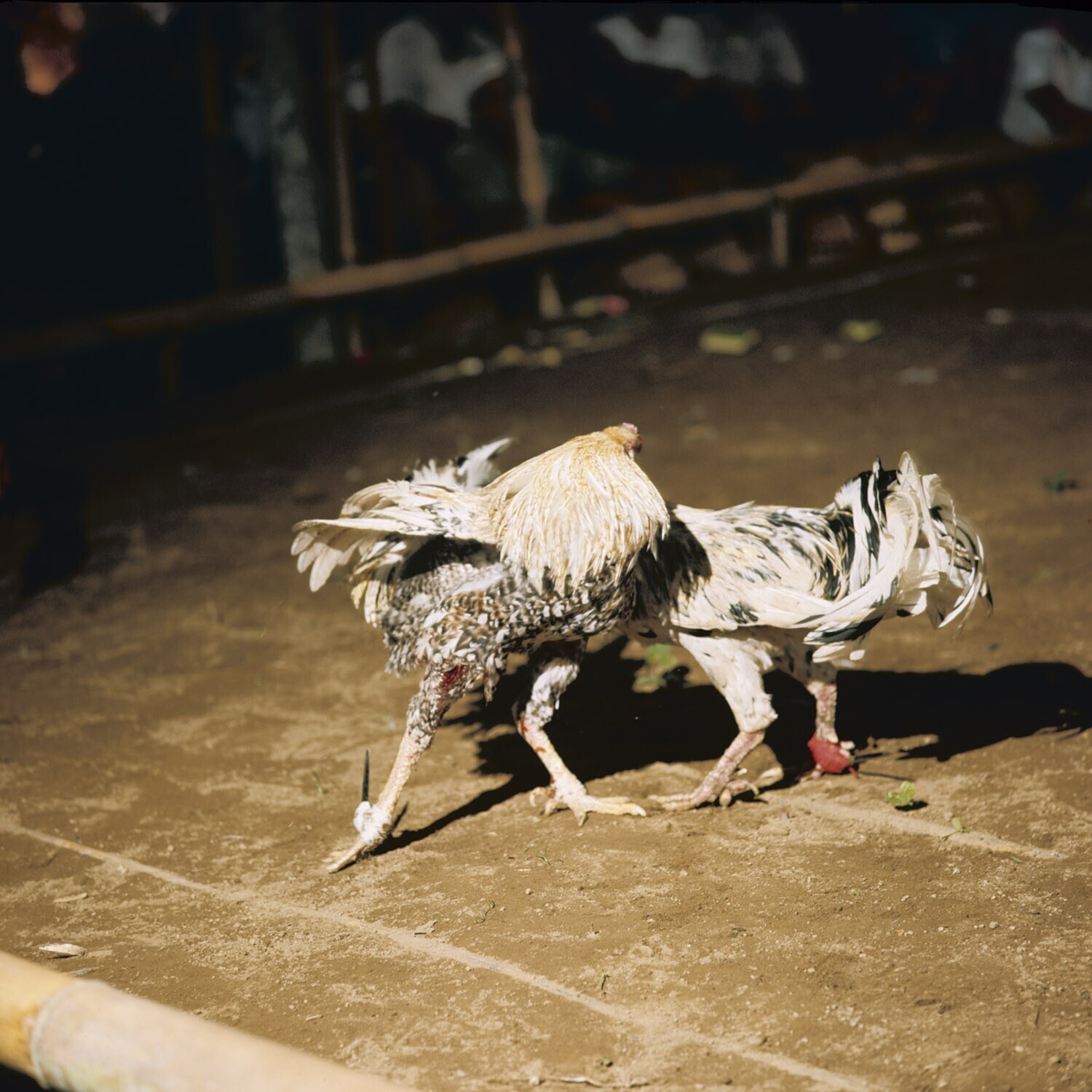 Hanengevecht in kampong Besakih, Bali. Eettentje bij...