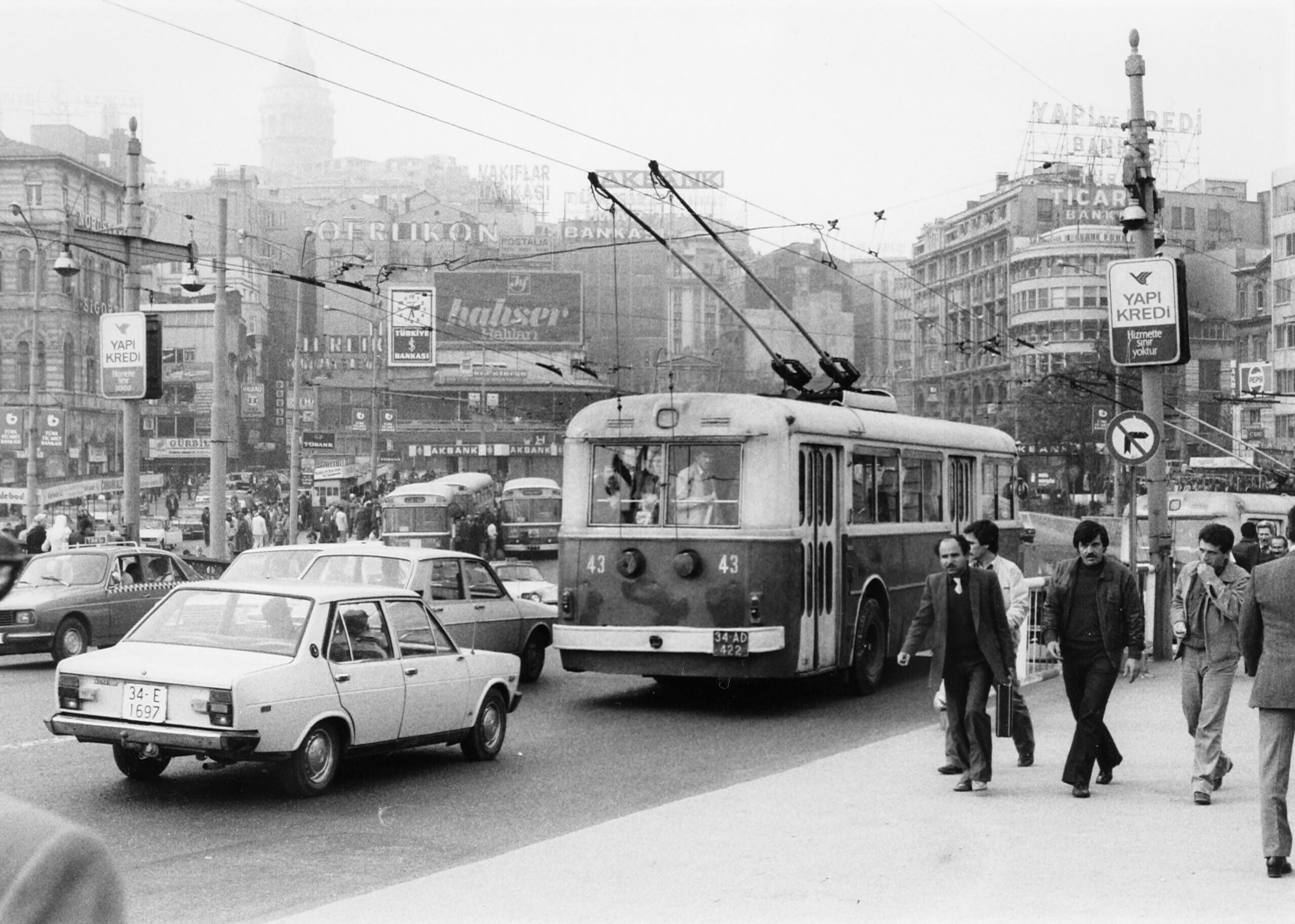 Istanbul. Stadsgezicht Trolley-bus. Op de achtergron...