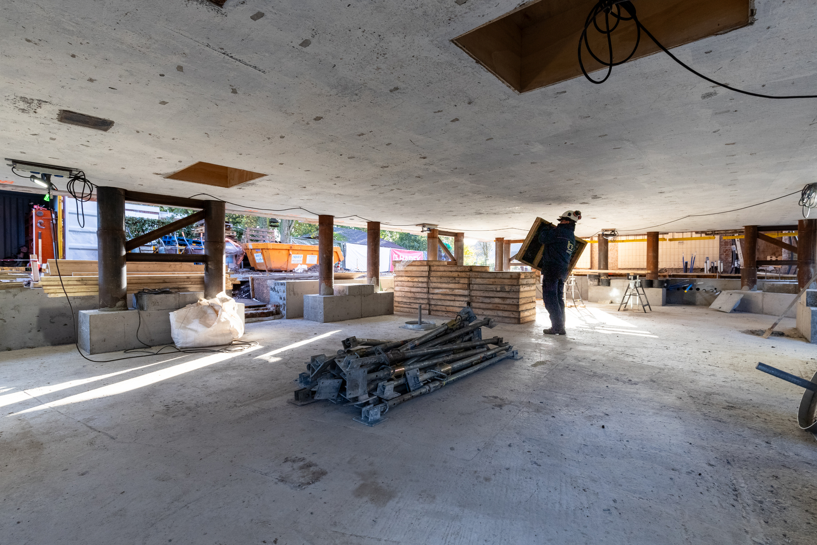 Funderingswerkzaamheden, met omhoog gevijzelde kerk