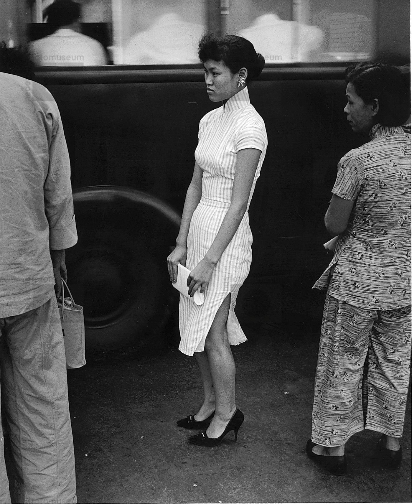 Jonge vrouw in Cheong-san-jurk op straat, Hongkong (...