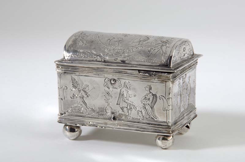 Theetrommel met in de hoeken van het bovenstuk van h...