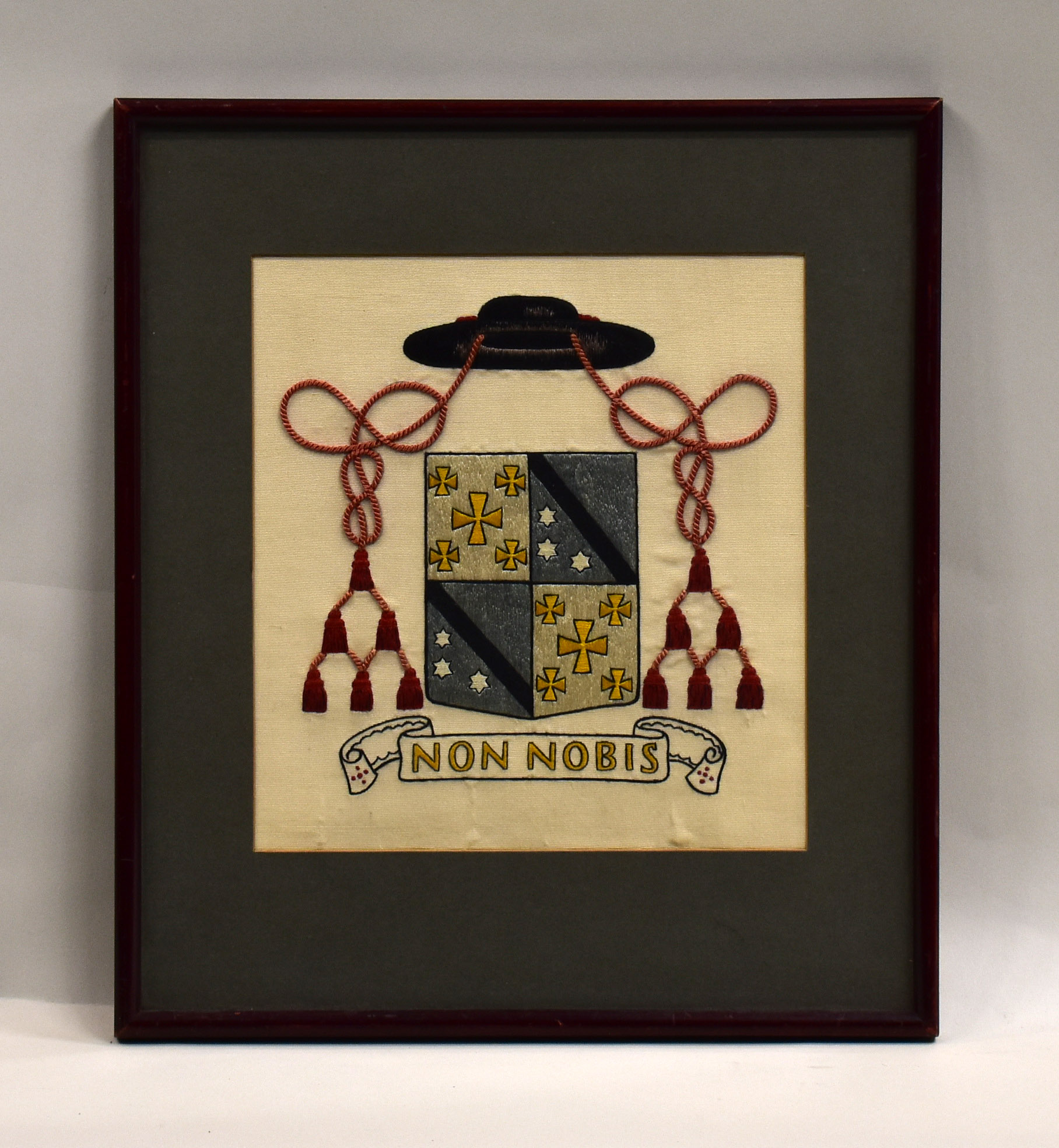Borduurwerk achter glas met prelatenhoed en wapen Mg...
