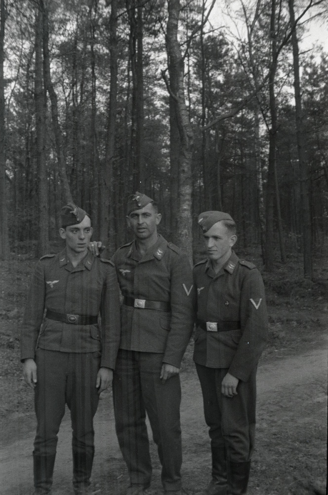 Drie Luftwaffe militairen poseren voor de foto in ee...