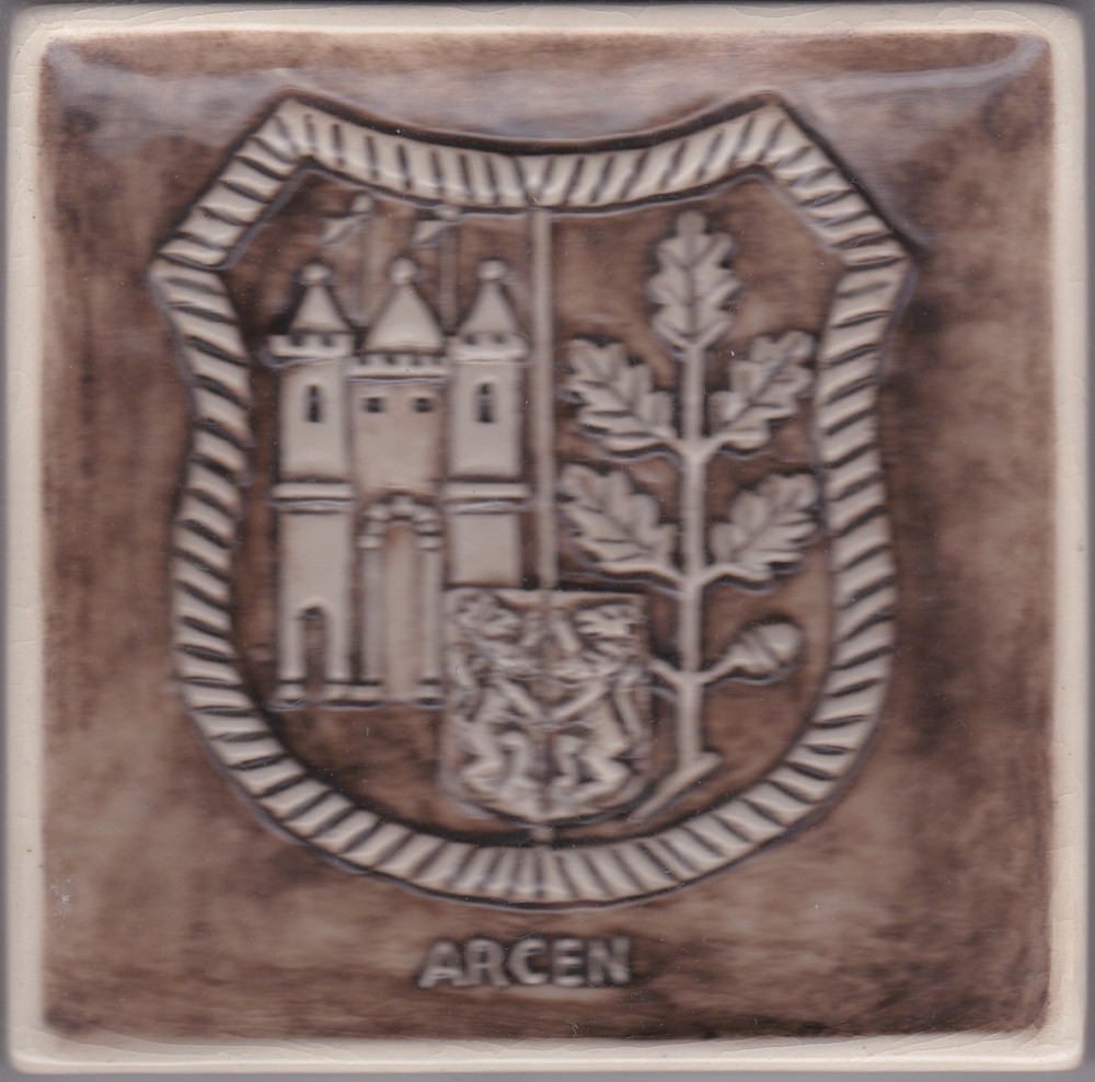 Tegel in reliëf, met voorstelling: wapen Arcen, verv...