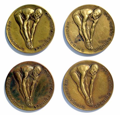 Bronzen herinneringspenning, opening Kolpabad 1955, ...