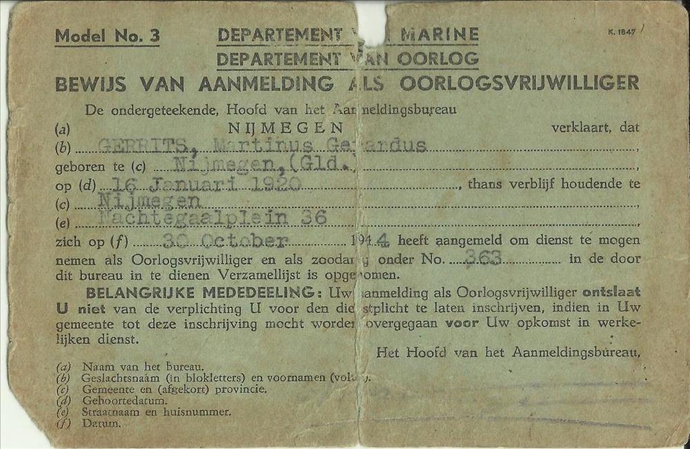 Bewijs van Aanmelding als Oorlogsvrijwilliger, model...