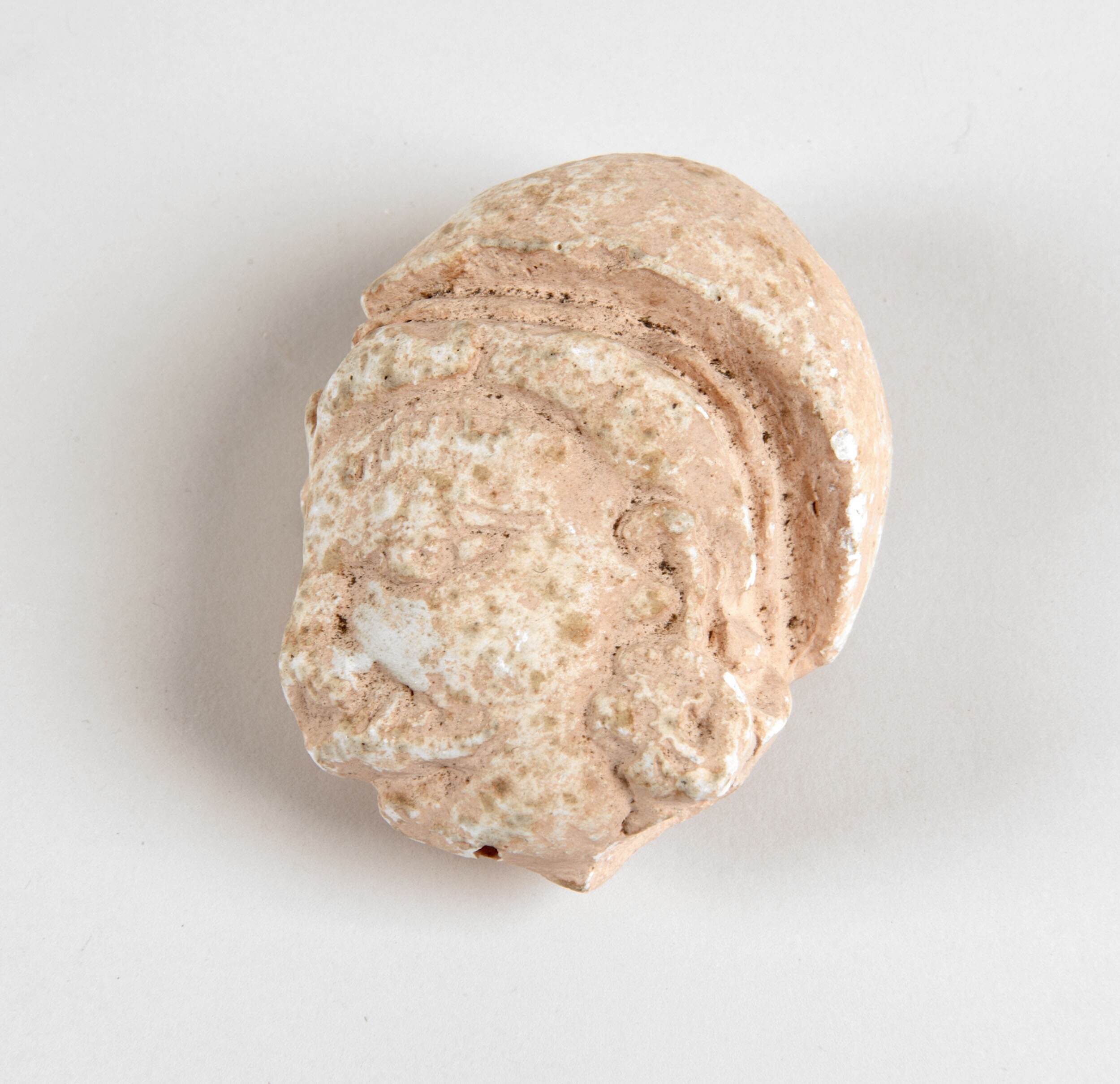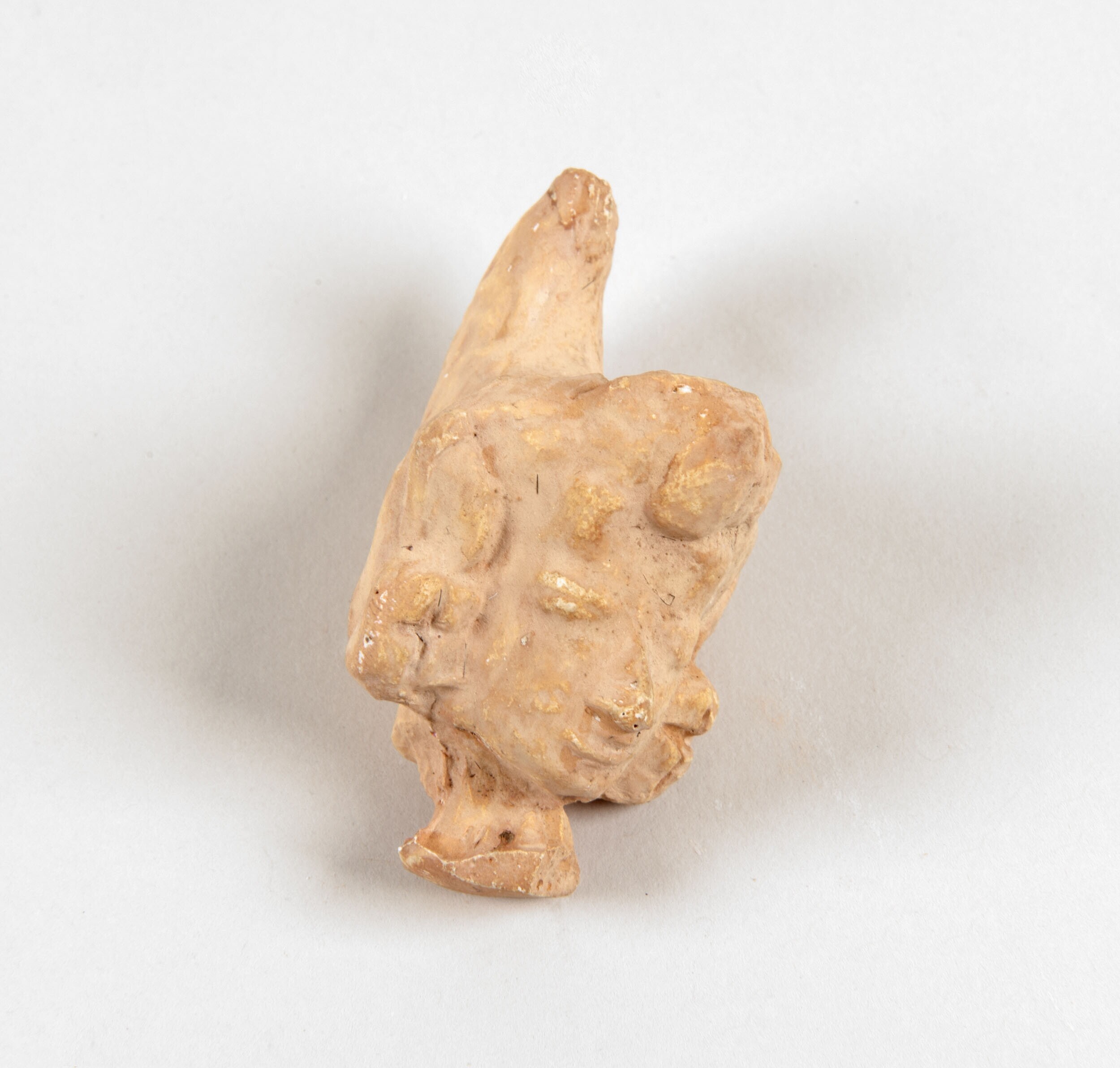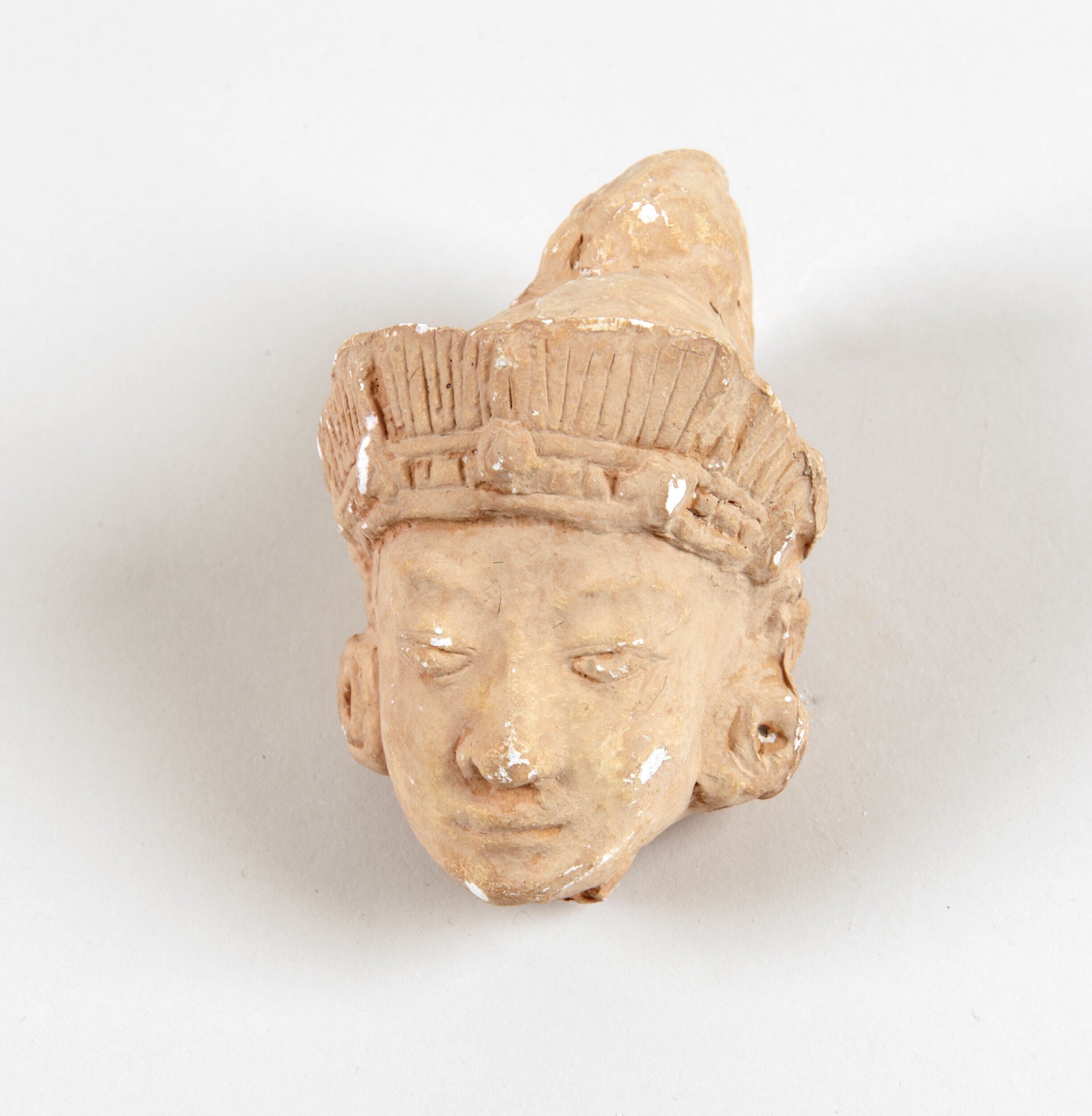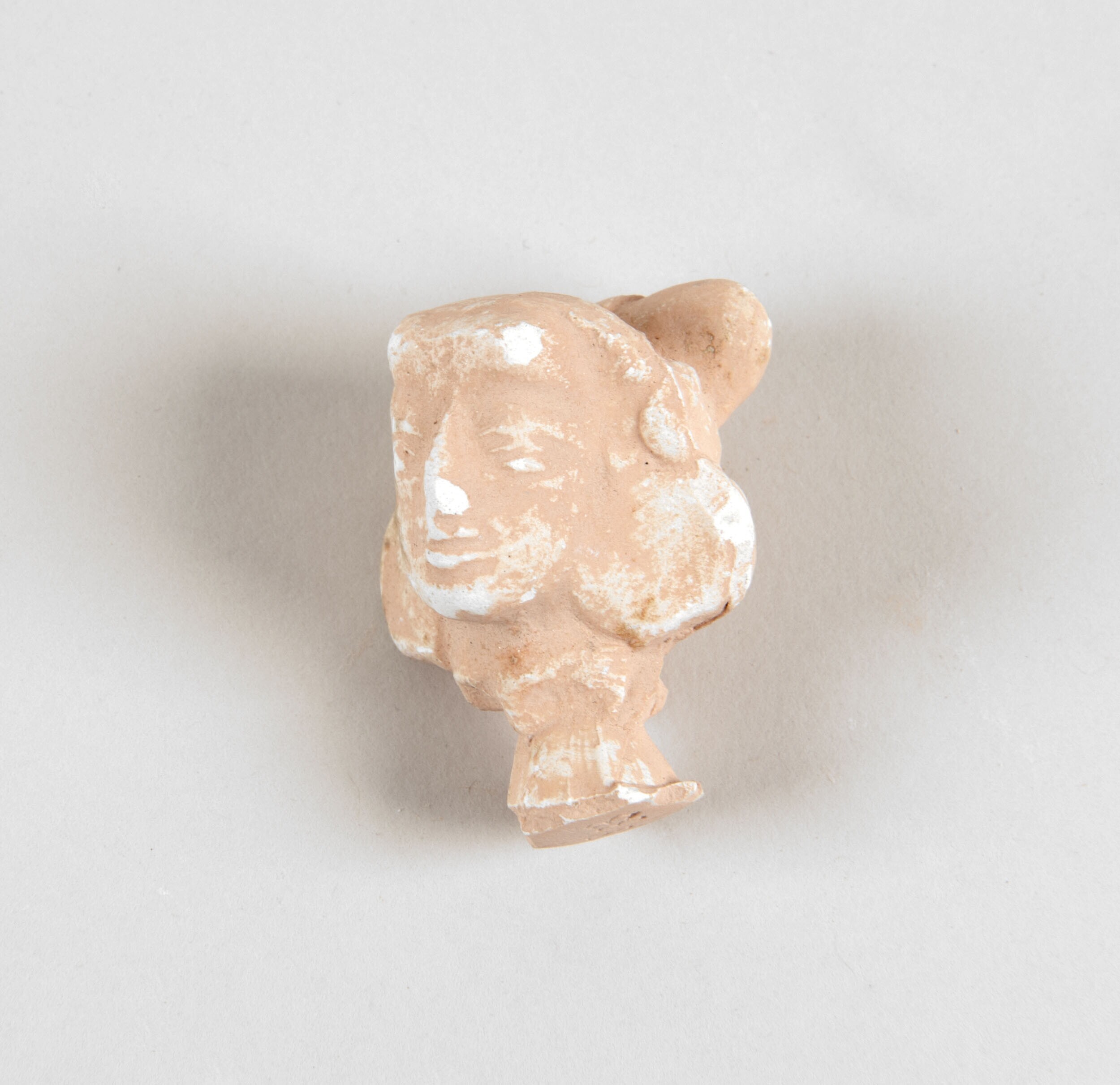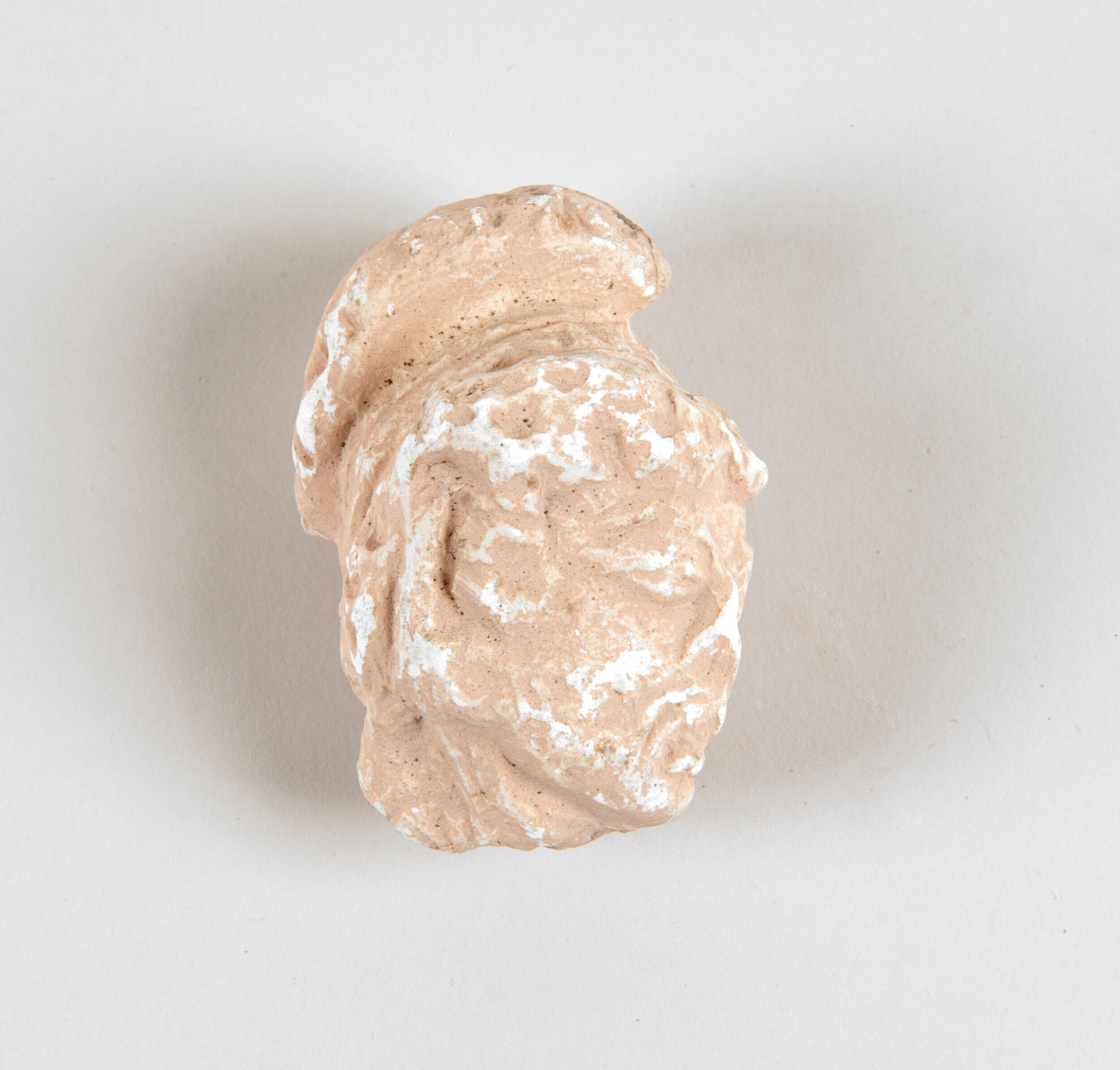 Gipsafgietsel Terracottakop met puntmuts en kleine s...