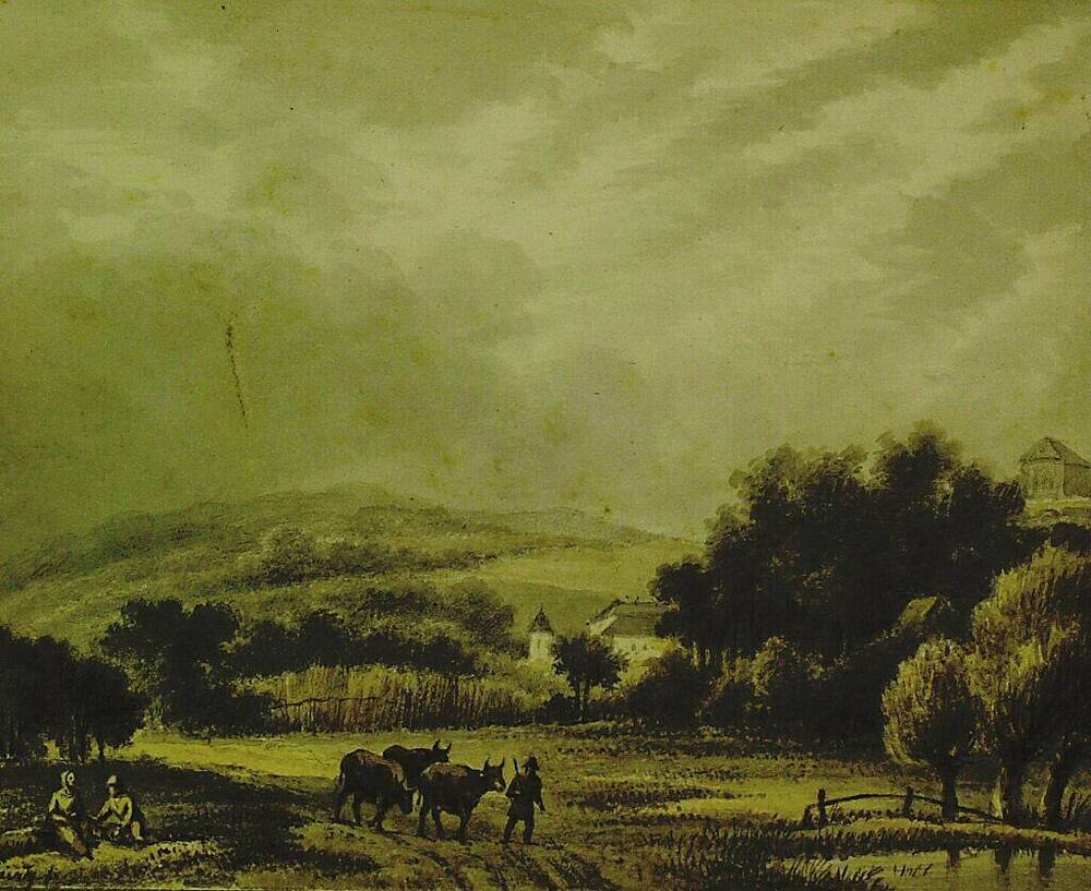penseel in bruin en grijs over sporen van zwart krijt; kaderlijn met zwart krijt (1)