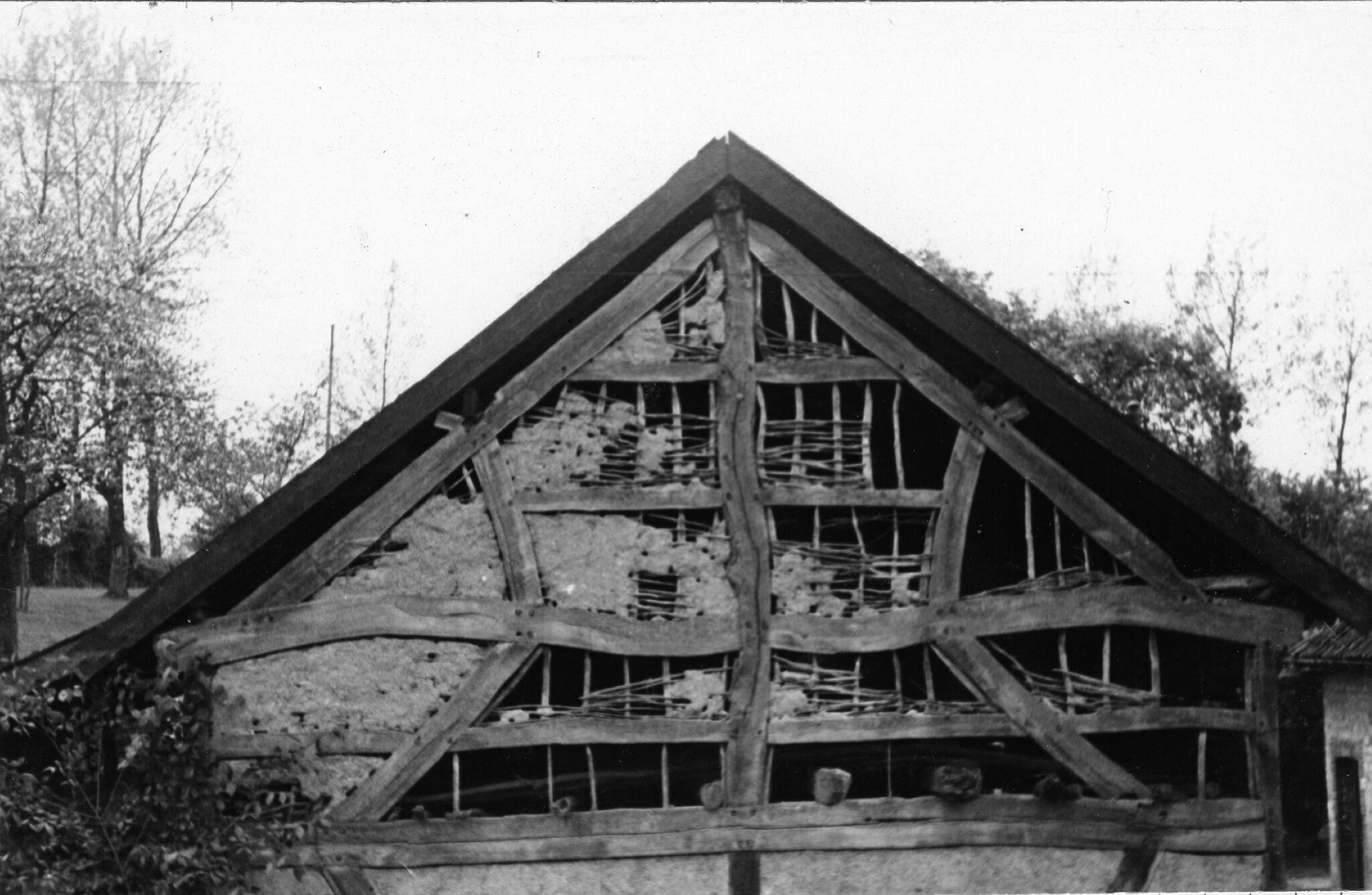 Topgevel van een schuur, Overeys, 1937 (zwart-wit foto)
