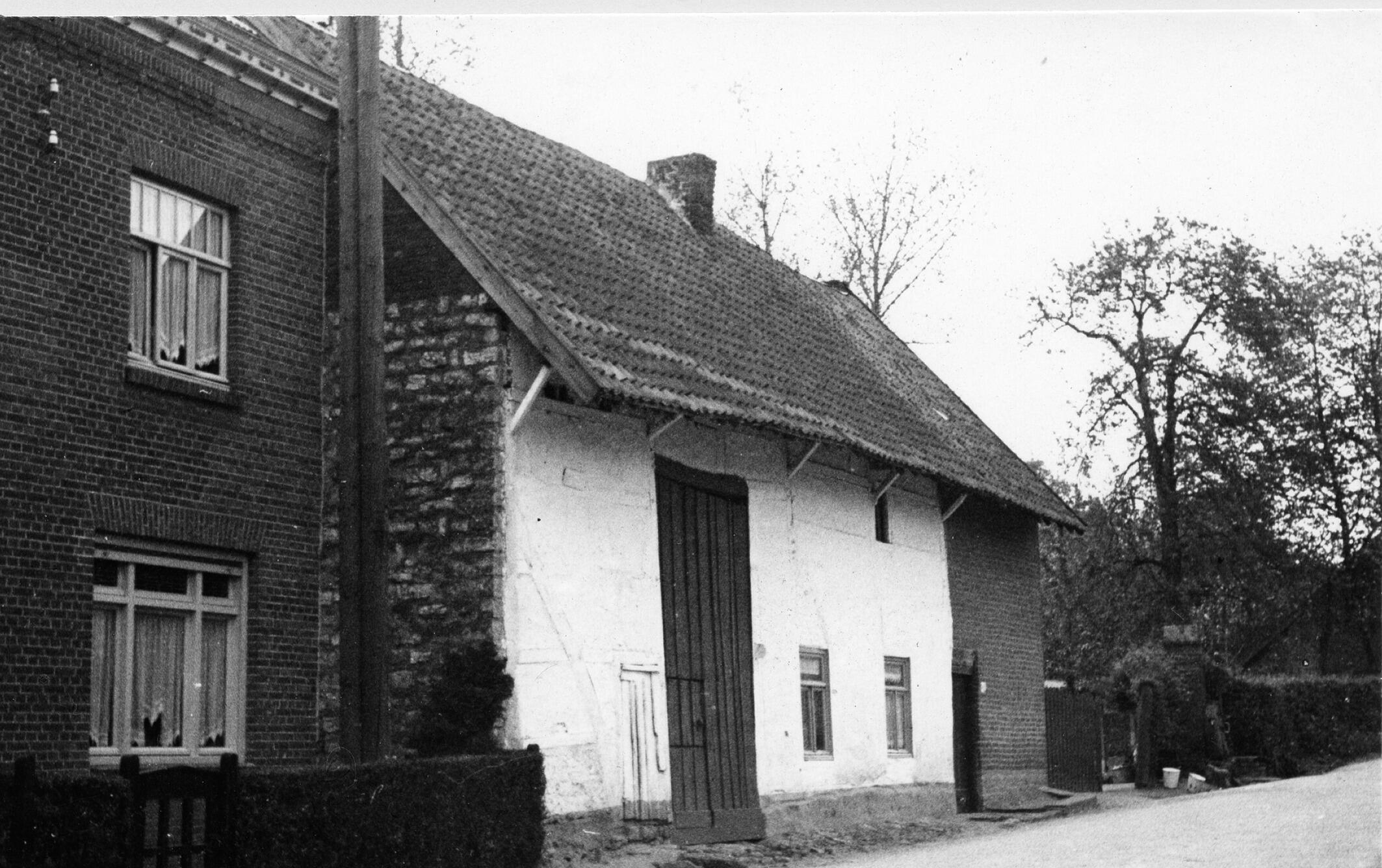 Schuur met vakwerkgevel, Overeys, 1937 (zwart-wit foto)