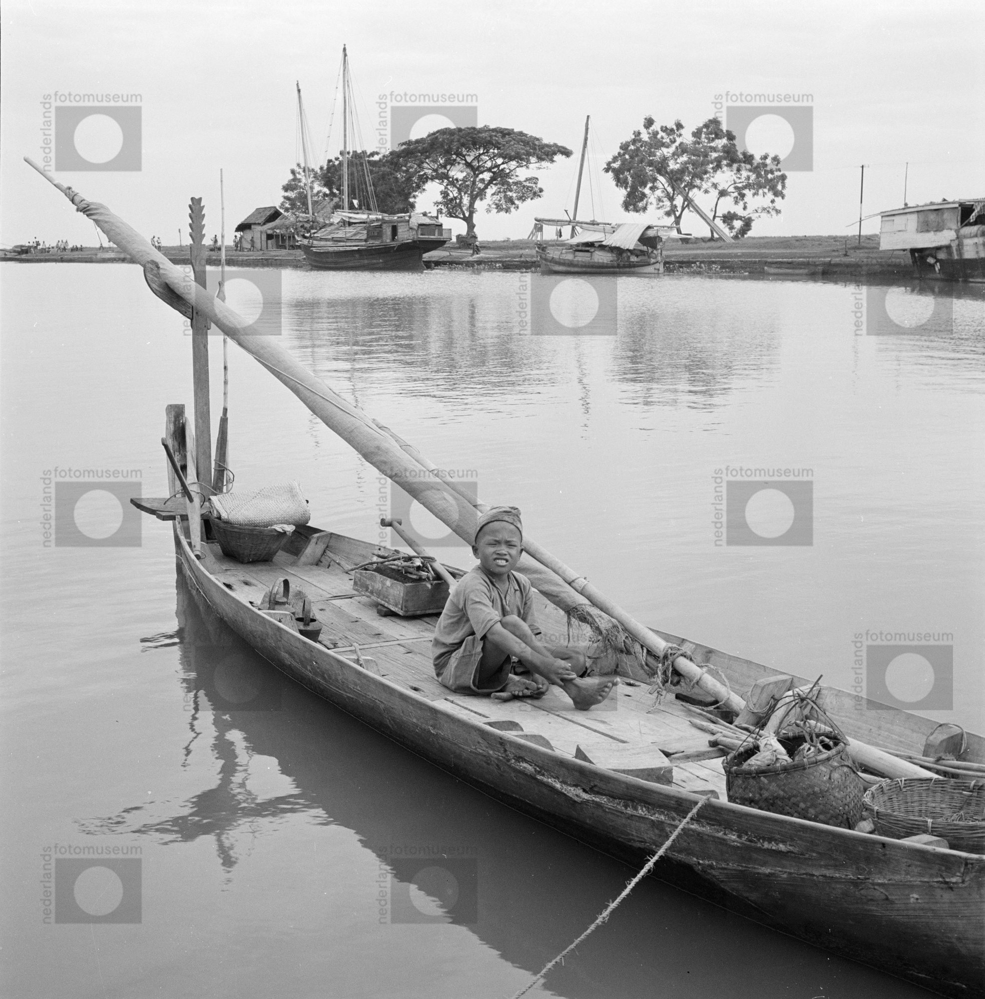 Jongen zit in een bootje op een rivier, Indonesië (1...