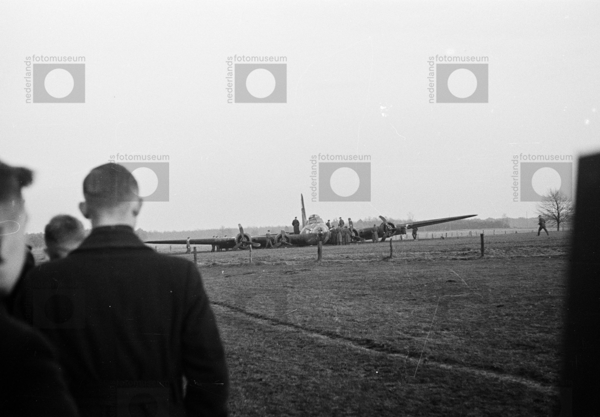 Groep toeschouwers kijkt naar neergestort vliegtuig ...