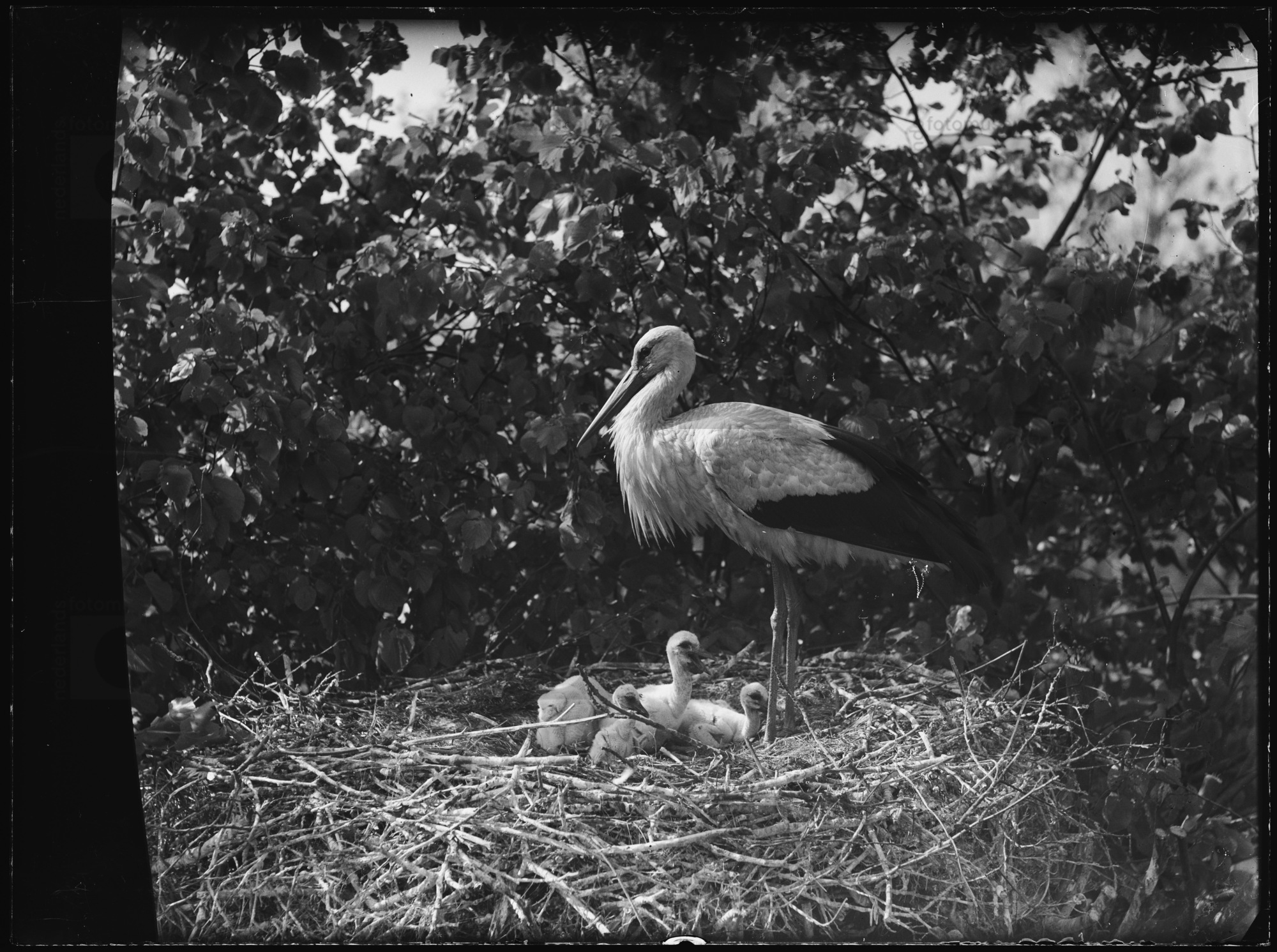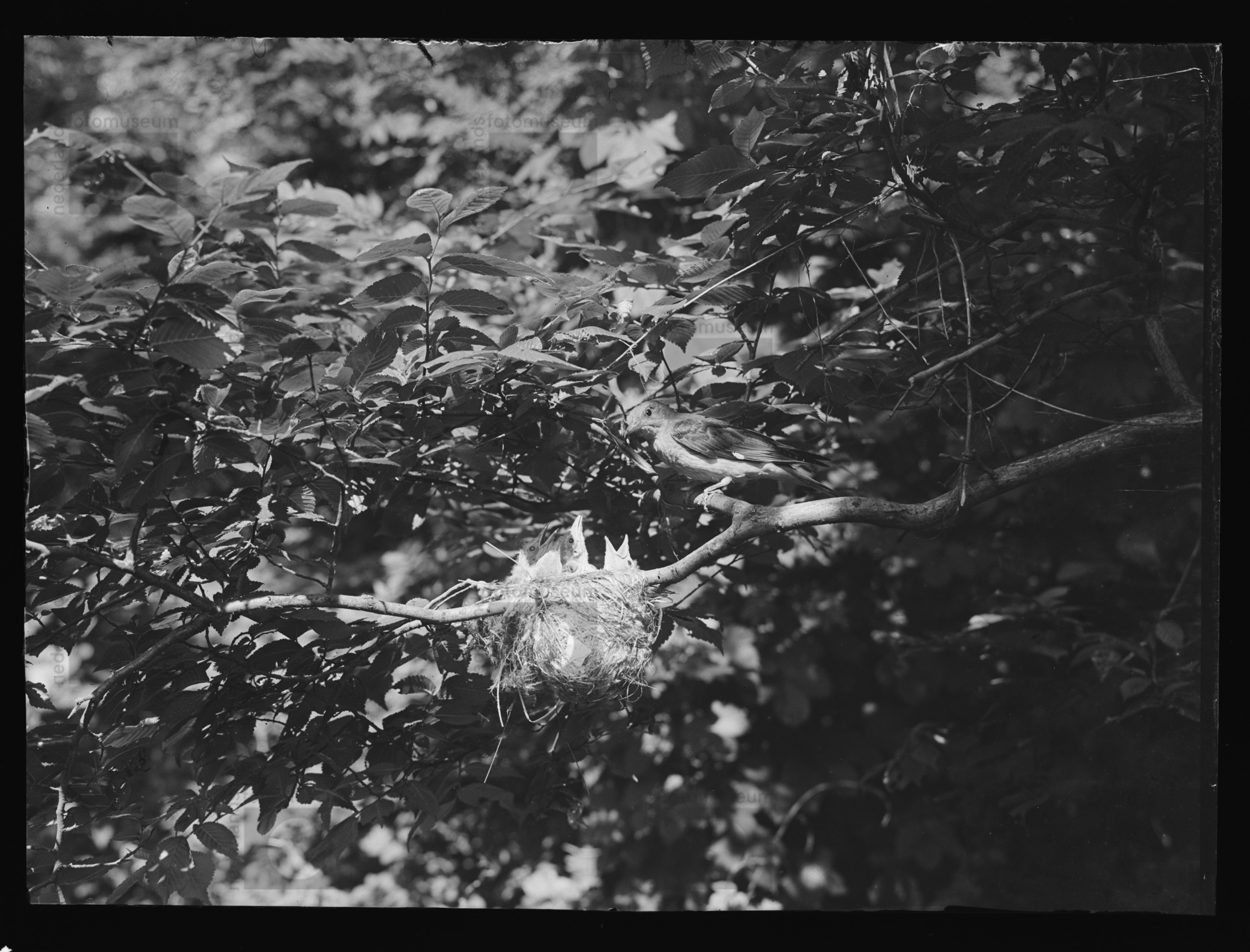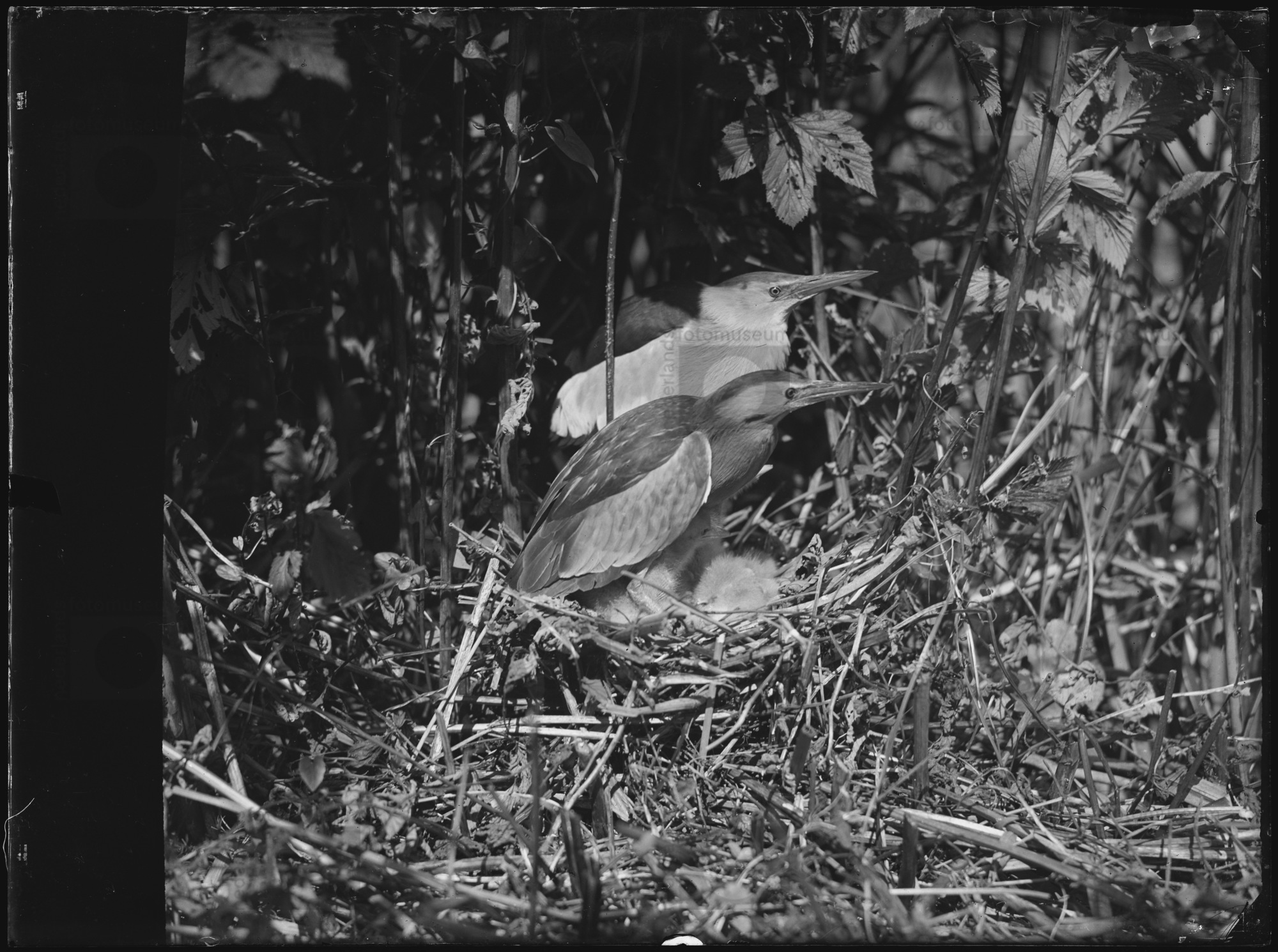 Vrouwtje Wielewaal bij jongen in nest, Egmond (1949)
