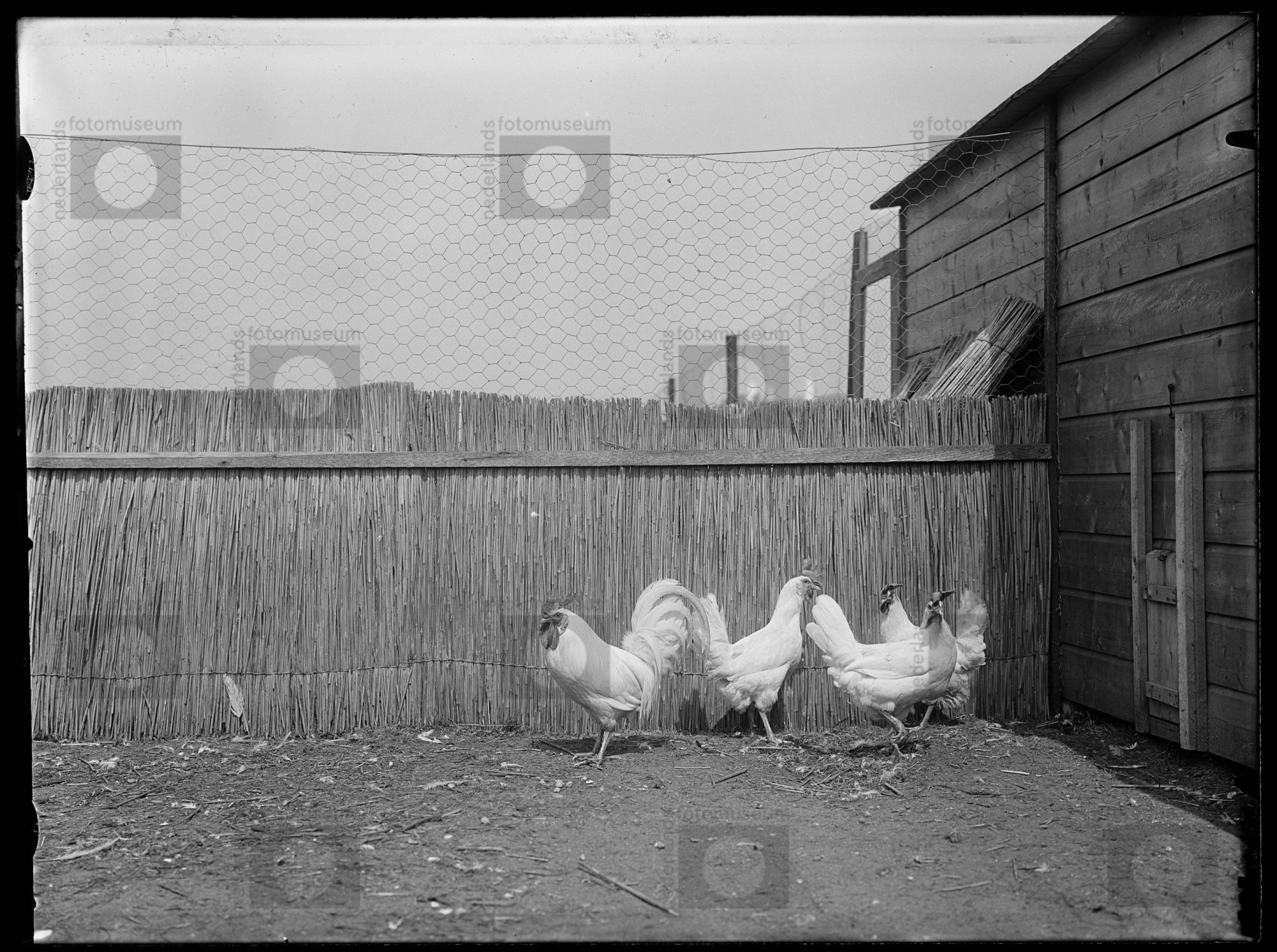 Witte Leghorns,, haan met drie kippen, in ren op het...