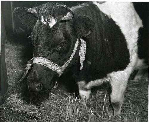 Foto in zwart-wit van een koe op stro door J.D. de J...