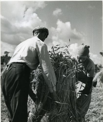 Foto in zwart-wit van het binden van schoven door J....