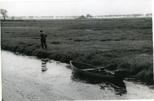 Foto in zwart-wit van roeiboot met melkbus door J.D....